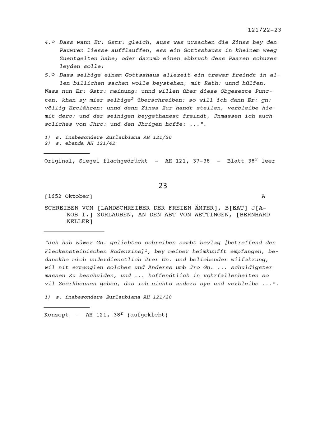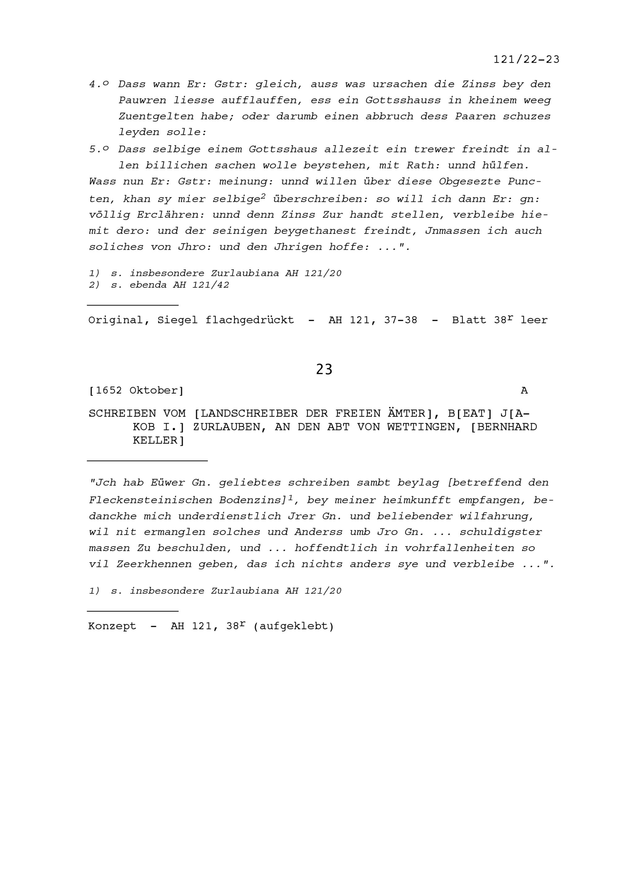 Schreiben von Beat Jakob I. Zurlauben, Landschreiber der Freien Ämter, an Bernhard Keller, Abt von Wettingen