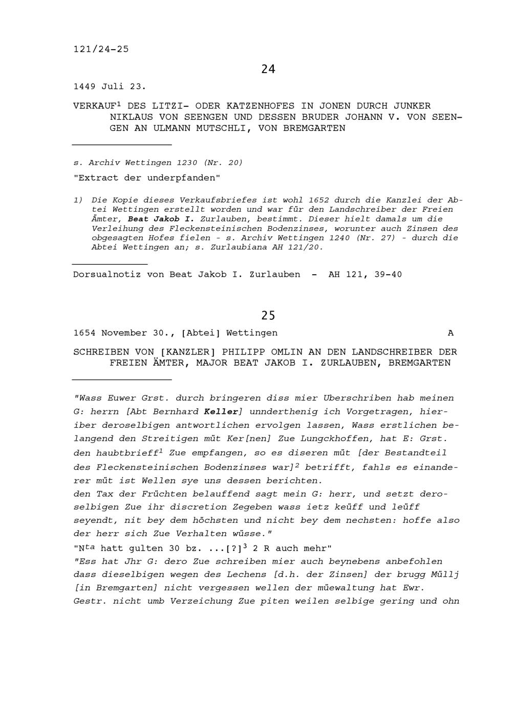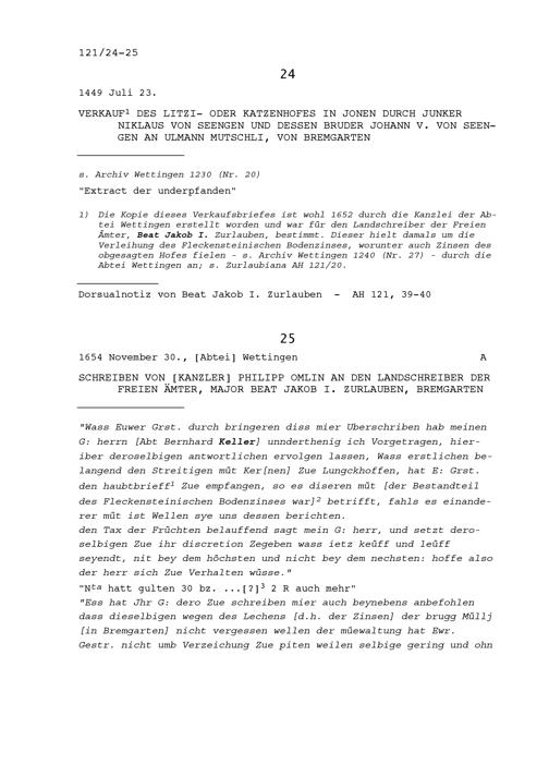 Verkauf des Litzi- oder Katzenhofes in Jonen durch Niklaus von Seengen und Johann V. von Seengen, dessen Bruder an Ulmann Mutschli, von Bremgarten