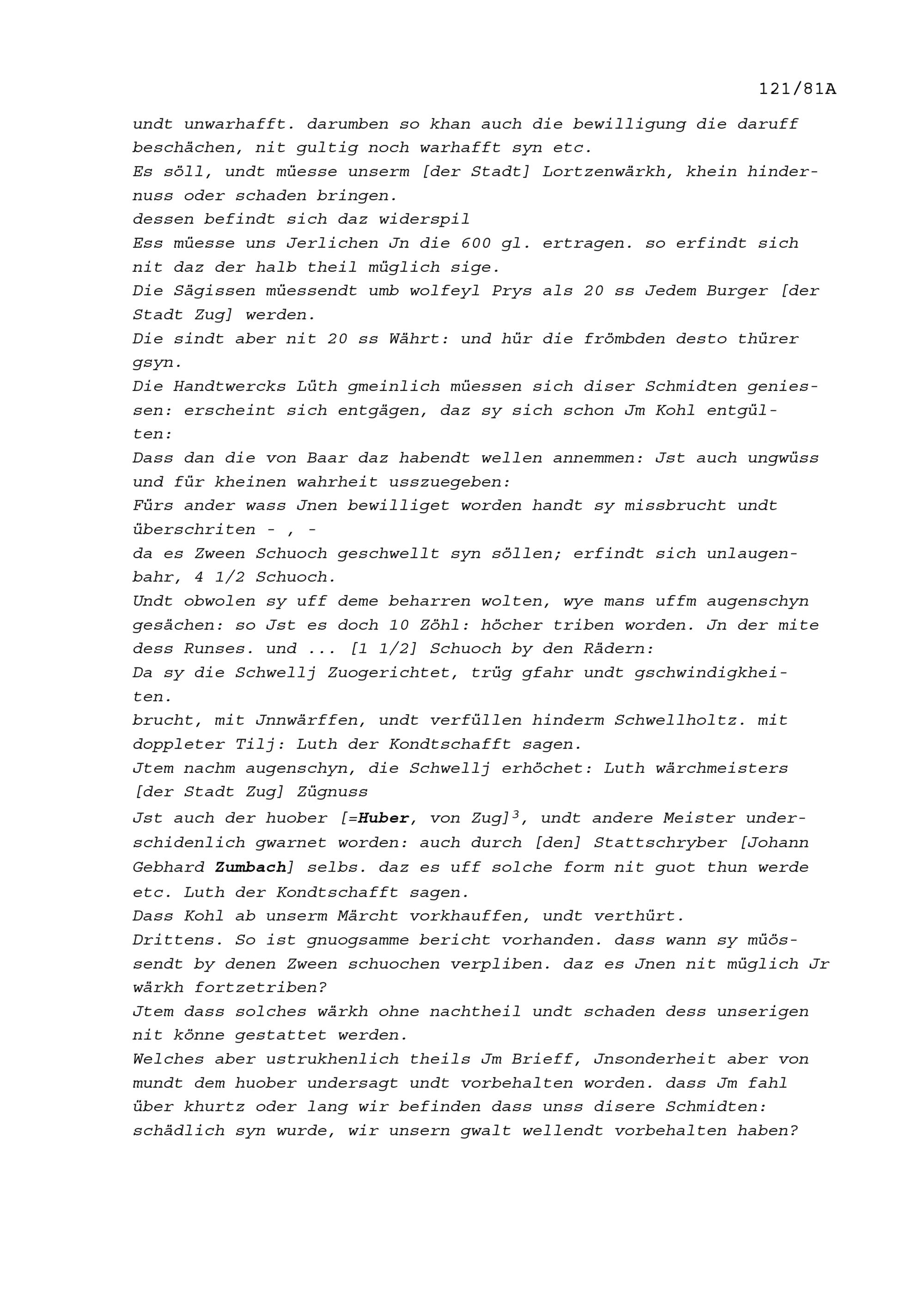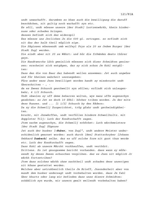 Notiz über den Betrieb einer Sensen- oder Hammerschmiede in Cham, aufgezeichnet von Beat II. Zurlauben, Zuger Stabführer
