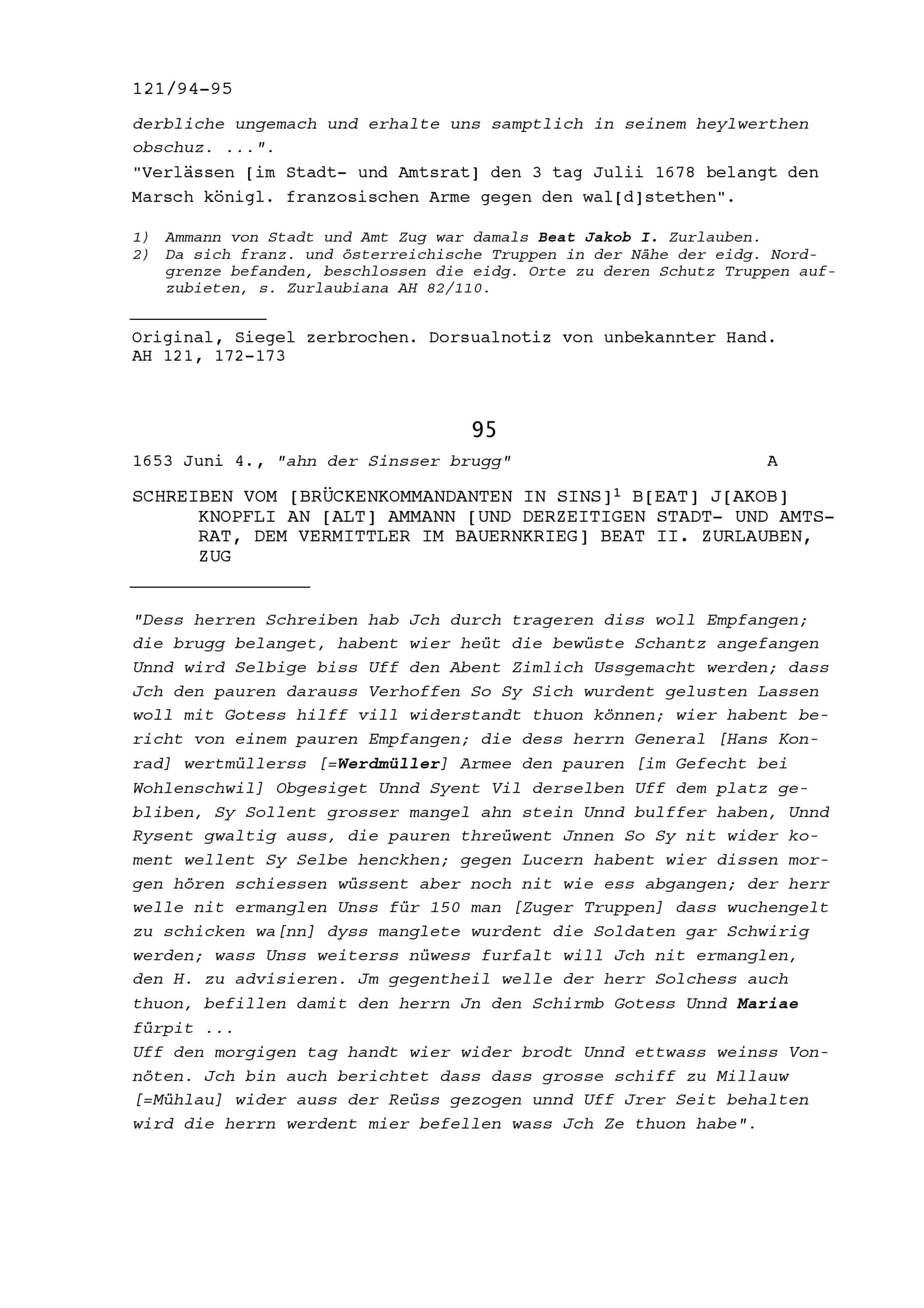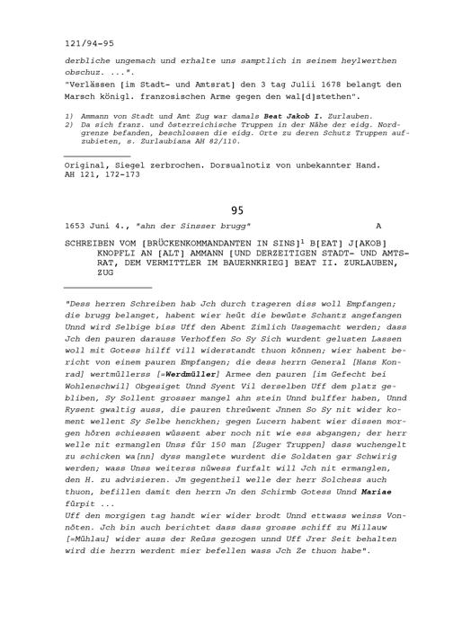 Schreiben von Beat Jakob Knopfli, Brückenkommandant in Sins, an Beat II. Zurlauben, Vermittler im Bauernkrieg, Altammann und Stadt- und Amtrat Zug