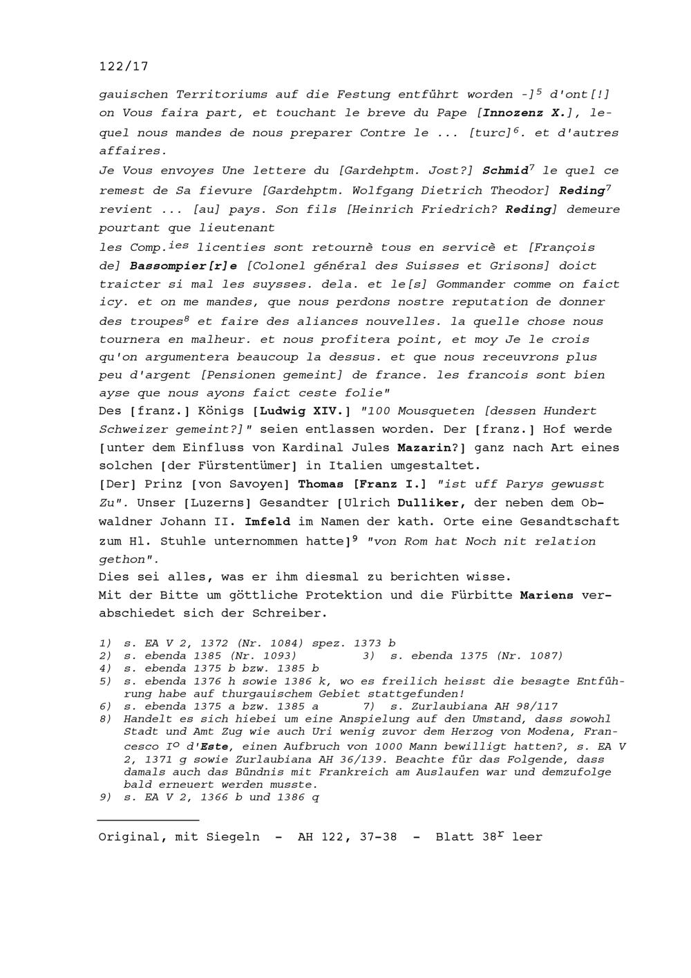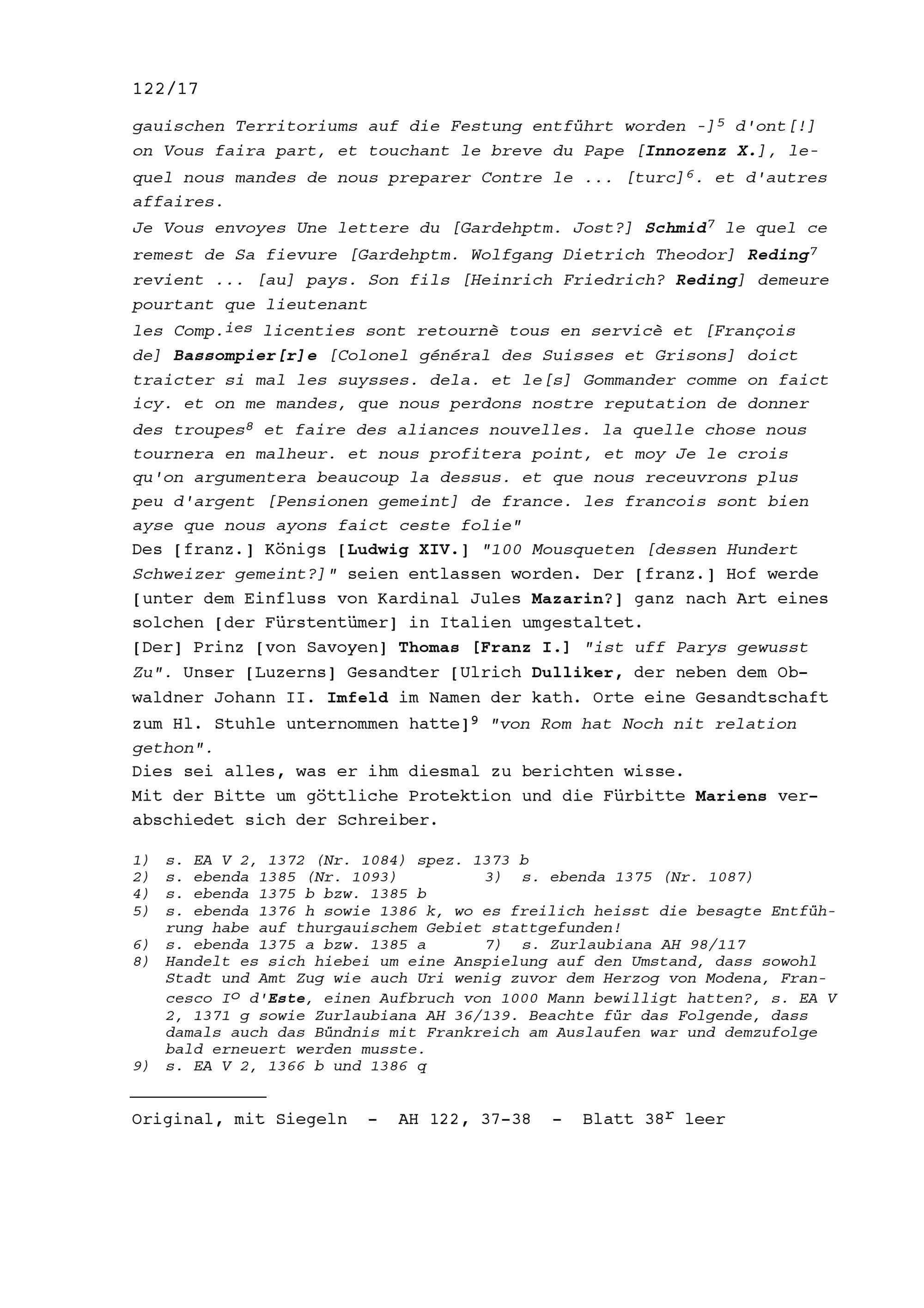 Schreiben von Kaspar Pfyffer, Ratsherr, an Beat II. Zurlauben, Altammann und Stadt-...