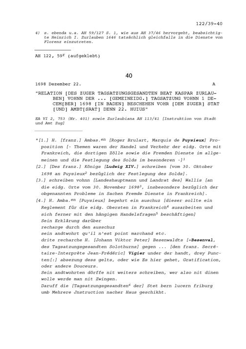 Bericht von Beat Kaspar Zurlauben, Tagsatzungsgesandter in Baden zuhanden des Stadt- und Amtrats Zug