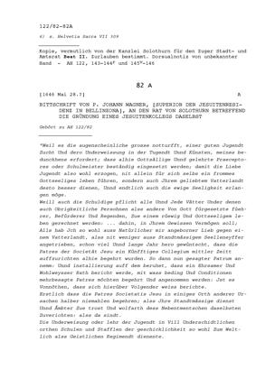 Bittschrift von Johann Wagner, Jesuitenpater und Subprior der Residenz in Bellinzona, an den Rat Solothurn betreffend die Gründung eines Jesuitenkollegs