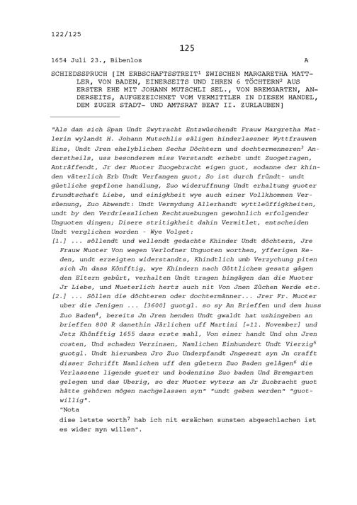 Schiedsspruch im Erbschaftsstreit zwischen Margaretha Mattler, von Baden, einerseits und ihren sechs Töchtern aus Erster Ehe mit Johann Mutschli, selig, von Bremgarten, anderseits, aufgezeichnet von Beat II. Zurlauben, Vermittler in diesem Handel und Stadt- und Amtrat Zug