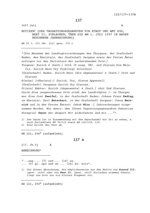 Notiz von Beat II. Zurlauben, Tagsatzungsgesandter, über die am 1. Juli 1657 begonnene...