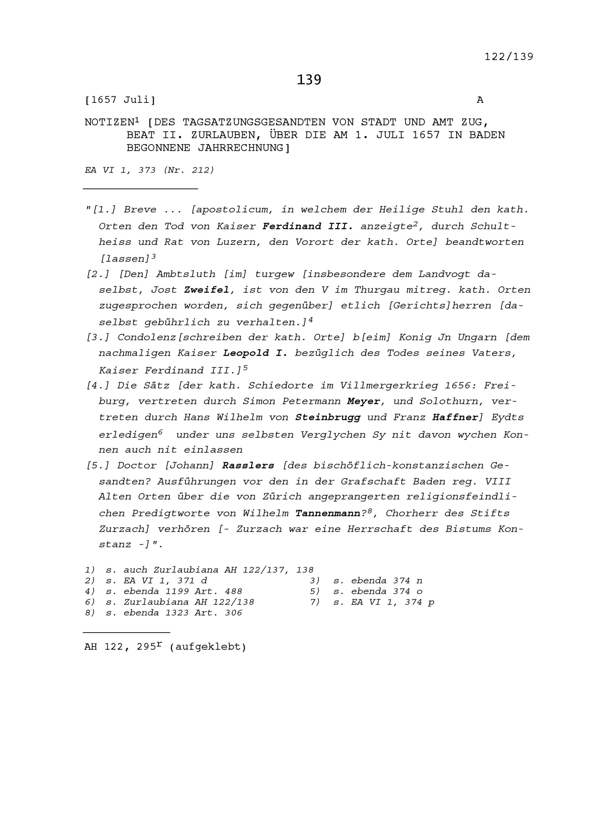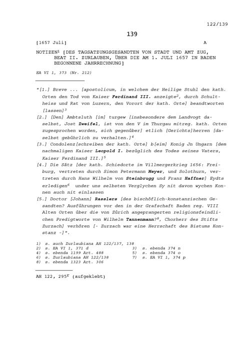 Notiz von Beat II. Zurlauben, Tagsatzungsgesandter, über die am 1. Juli 1657 begonnene...