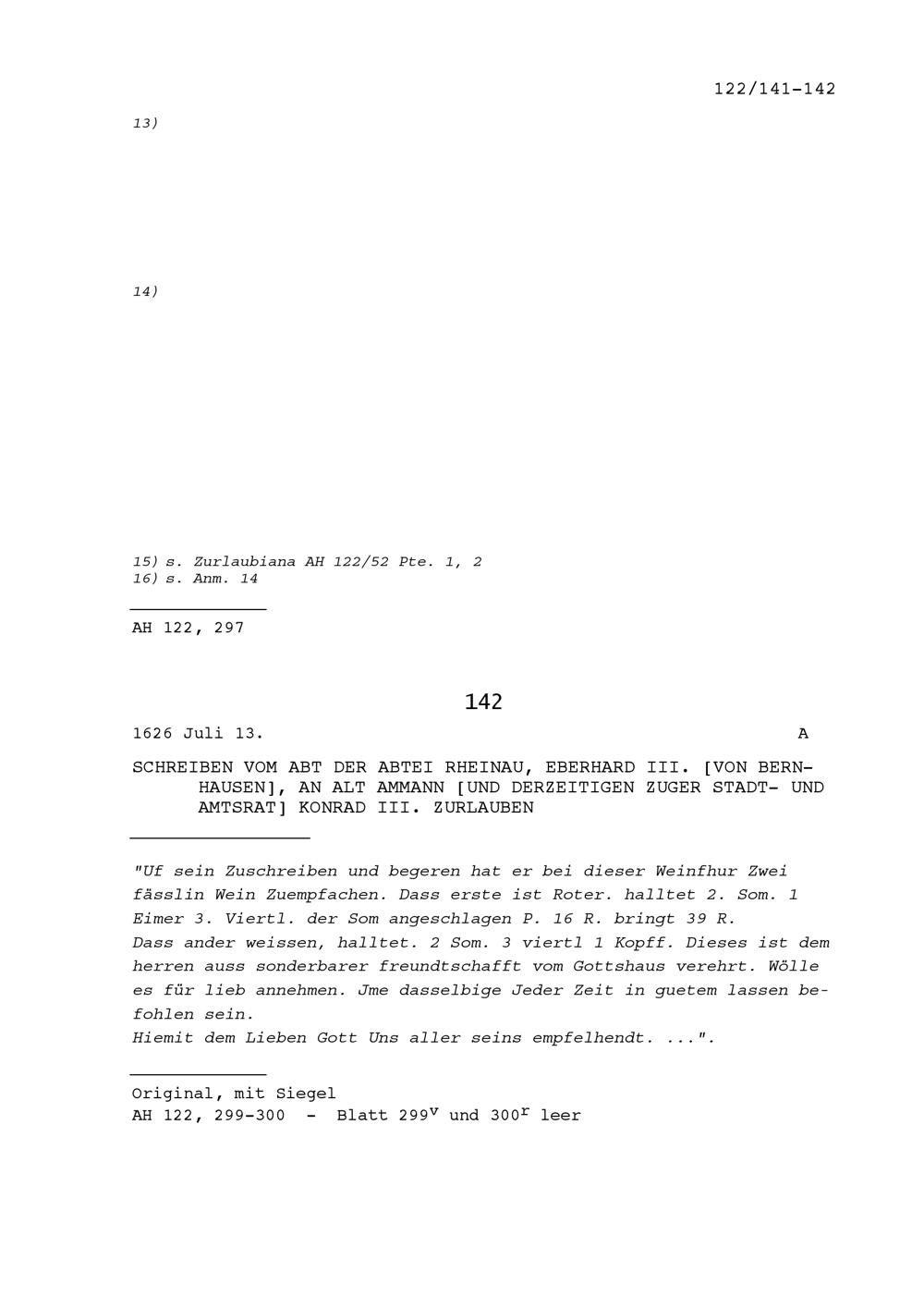 Schreiben Eberhard III. von Bernhausen, von Abt der Abtei Rheinau, an Konrad III. Zurlauben, Altammann und Stadt- und Amtrat Zug