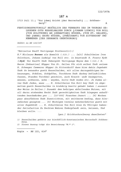 Fertigungsprotokoll bezüglich des Verkaufs des im Thurgau gelegenen Guts Kesselhalden durch Johann Ludwig von Roll von Solothurn an Sebastian Högger, von Sankt Gallen, und an Hans Georg Högger, Prädikant von Sitterdorf und Kämmerer des Dekanats Oberthurgau