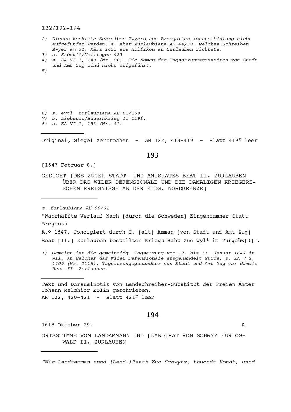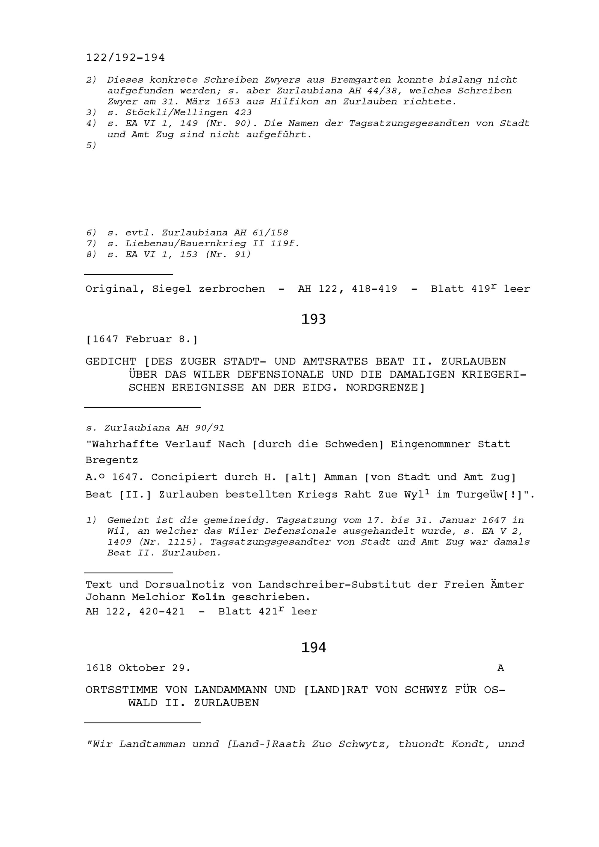 Gedicht von Beat II. Zurlauben, Stadt- und Amtrat Zug, über das Wiler Defensionale und die damaligen kriegerischen Ereignisse an der Eidgenössischen Nordgrenze