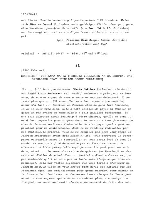 Schreiben von Anna Maria Theresia Zurlauben an Beat Heinrich Josef Zurlauben, Gardehauptmann und Brigadier