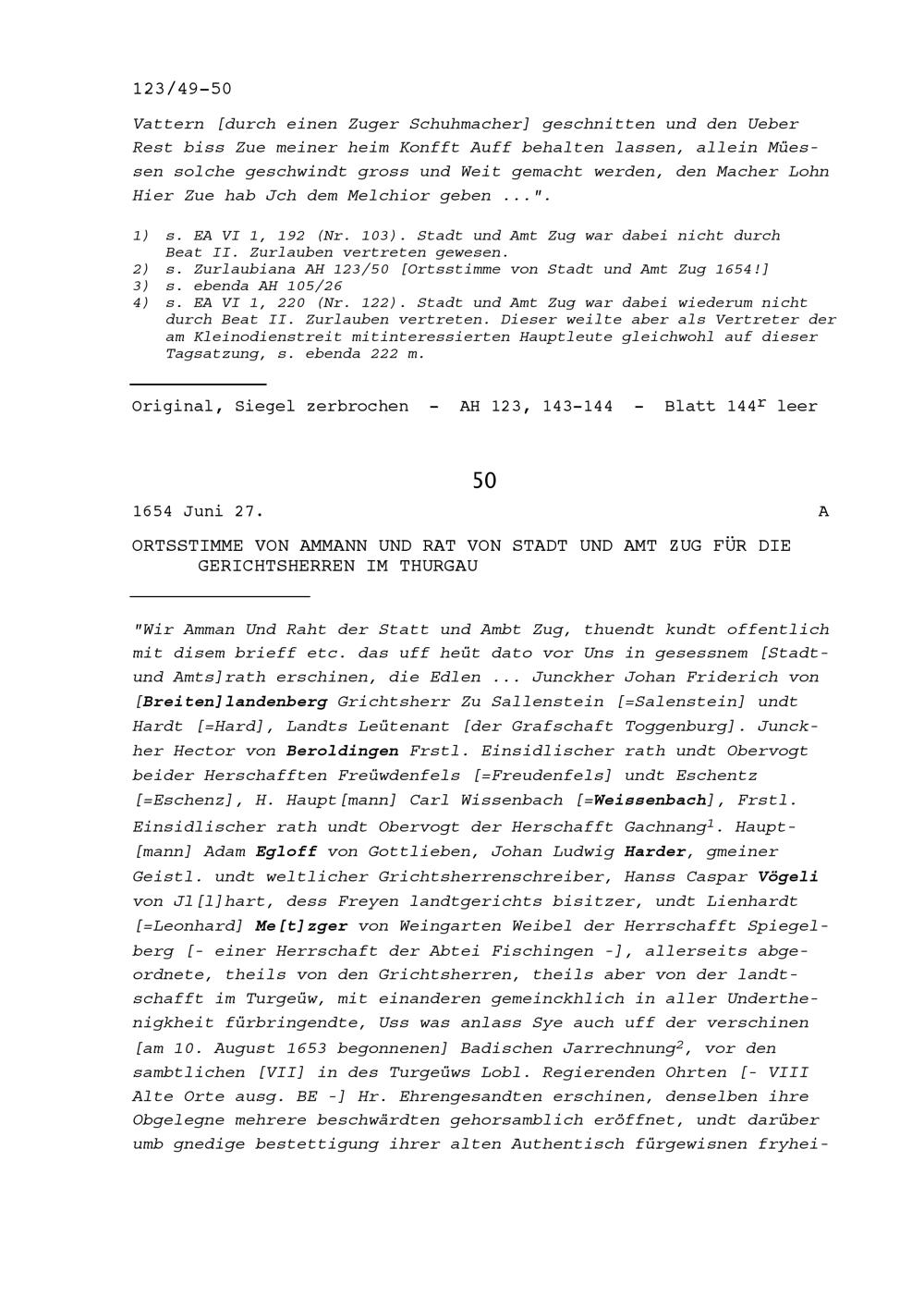 Ortsstimme des Ammanns und Rats von Stadt und Amt Zug für die Gerichtsherren im ...
