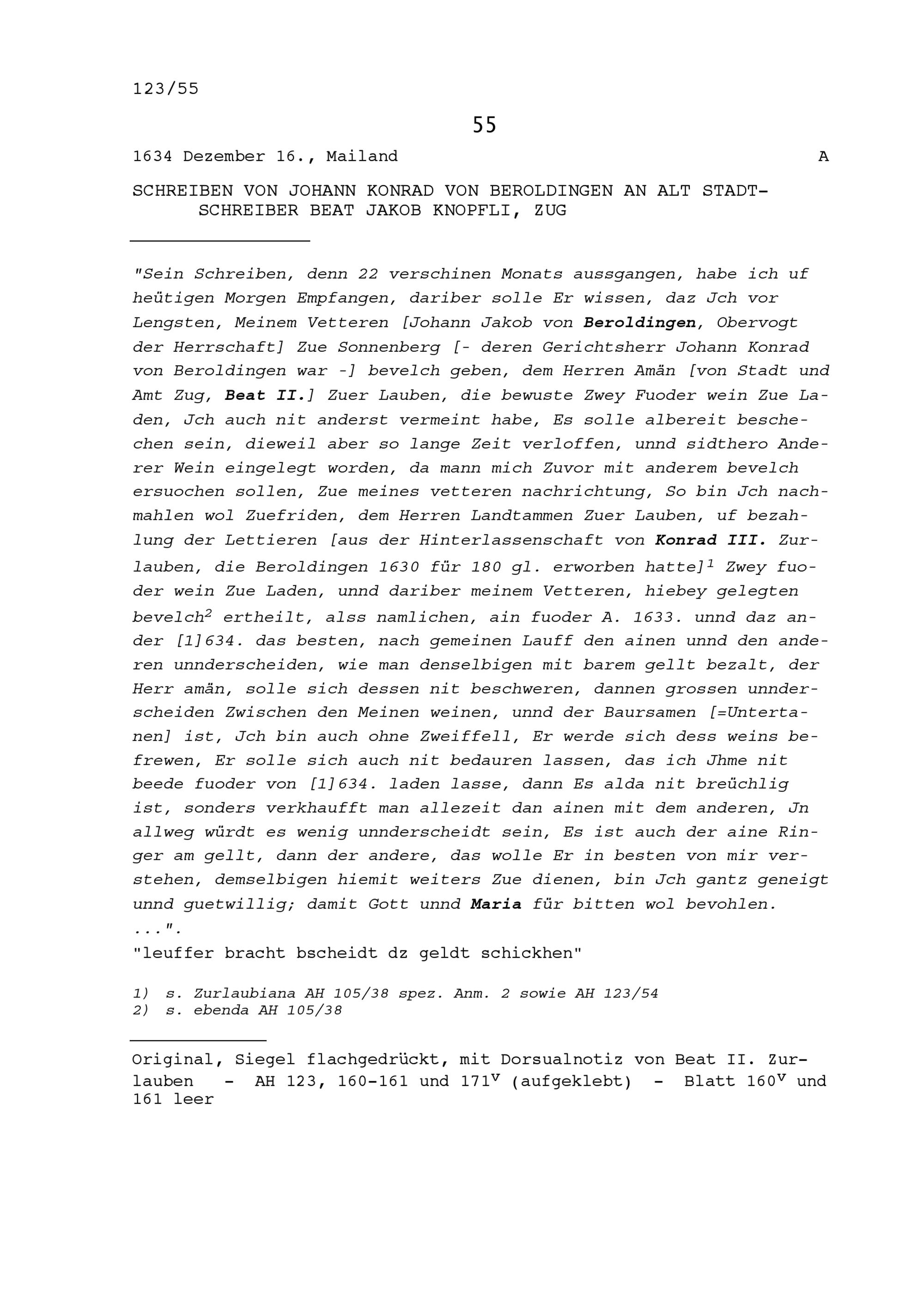 Schreiben von Johann Konrad von Beroldingen an Beat Jakob Knopfli, Altstadtschreiber, Zug