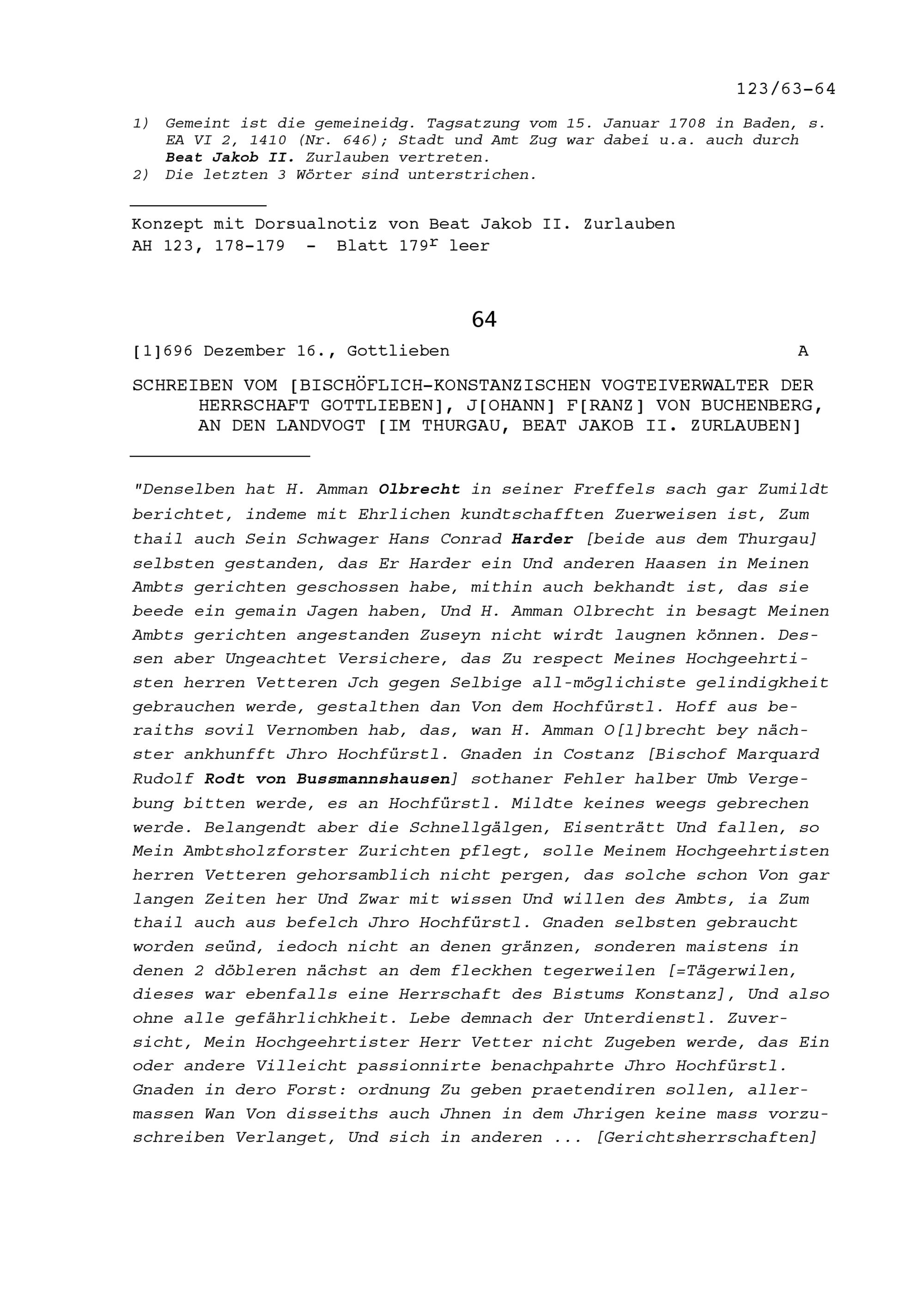 Schreiben von Johann Franz von Buchenberg, bischöflich-konstanzischer Vogteiverwalter der Herrschaft Gottlieben, an Beat Jakob II. Zurlauben, Landvogt im Thurgau