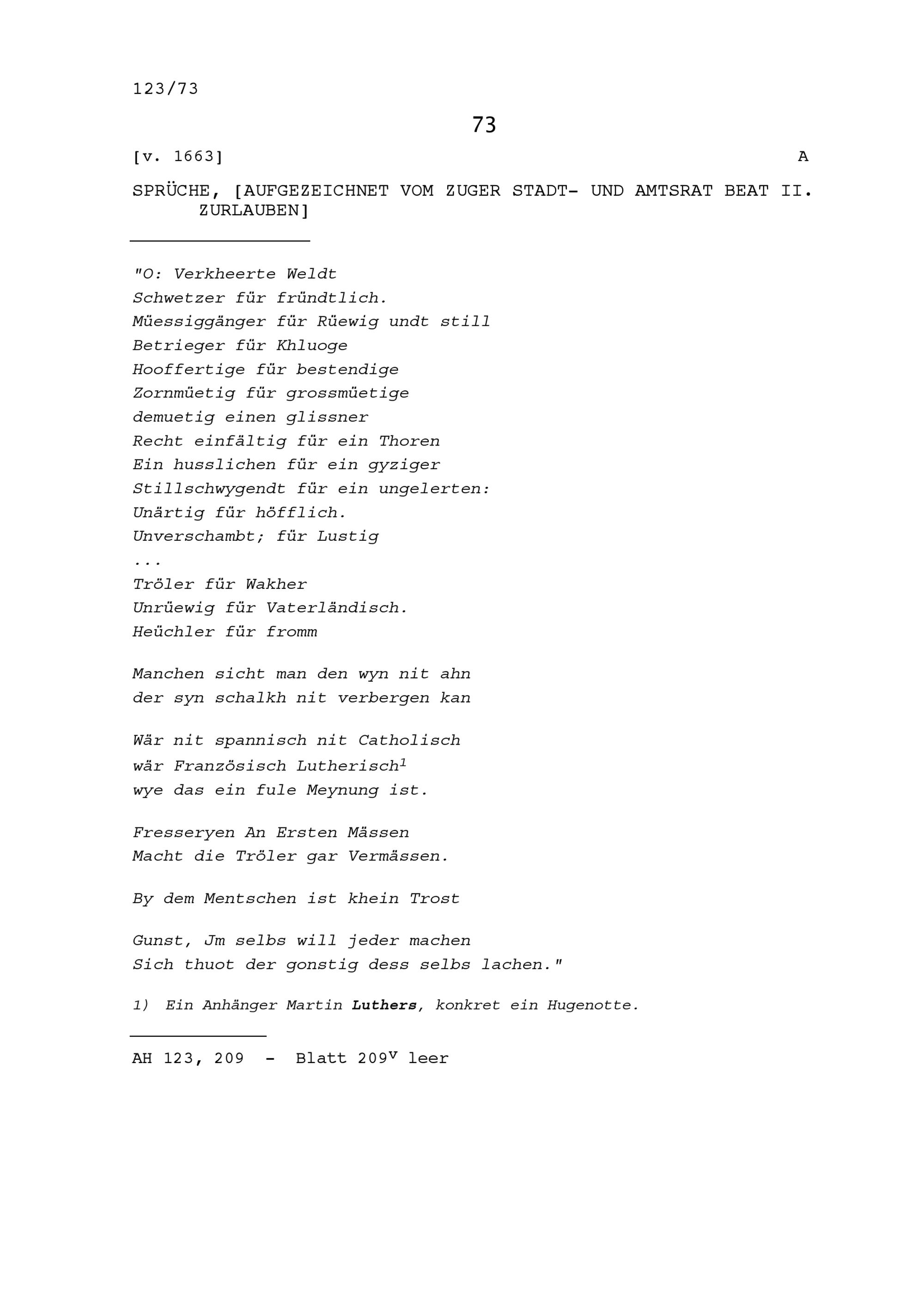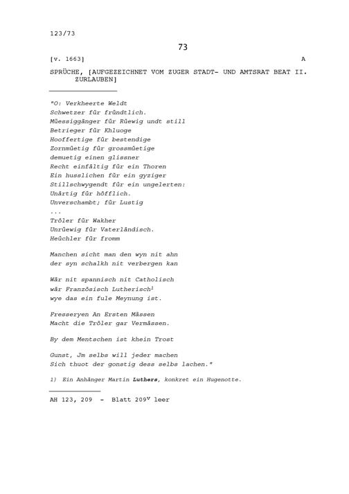Sprüche, aufgezeichnet von Beat II. Zurlauben, Stadt- und Amtrat Zug