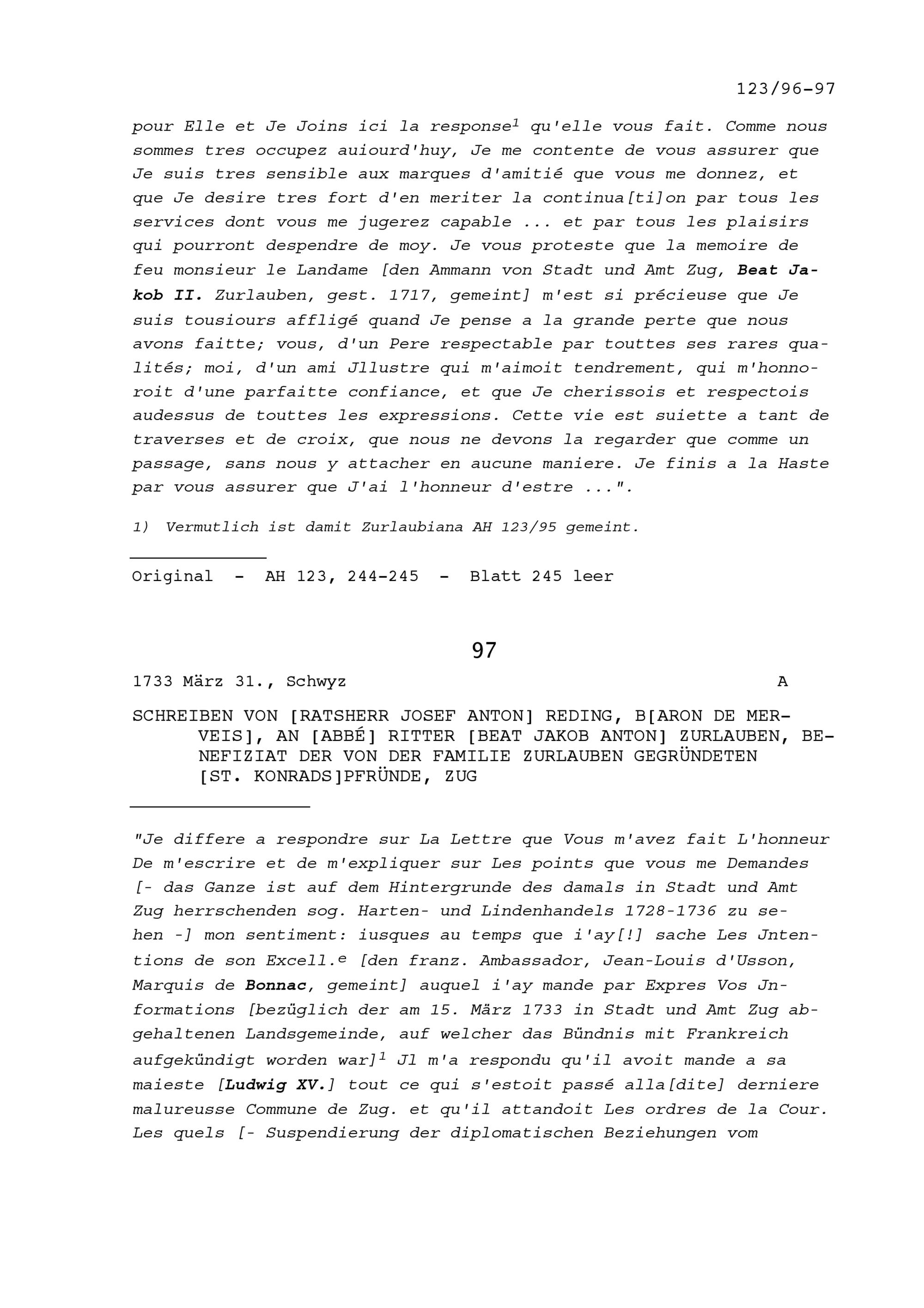 Schreiben von Josef Anton Reding, Baron de Merveis, Ratsherr, an Beat Jakob Anton Zurlauben, Priester und Benefiziat der Sankt Konradspfrund, Zug