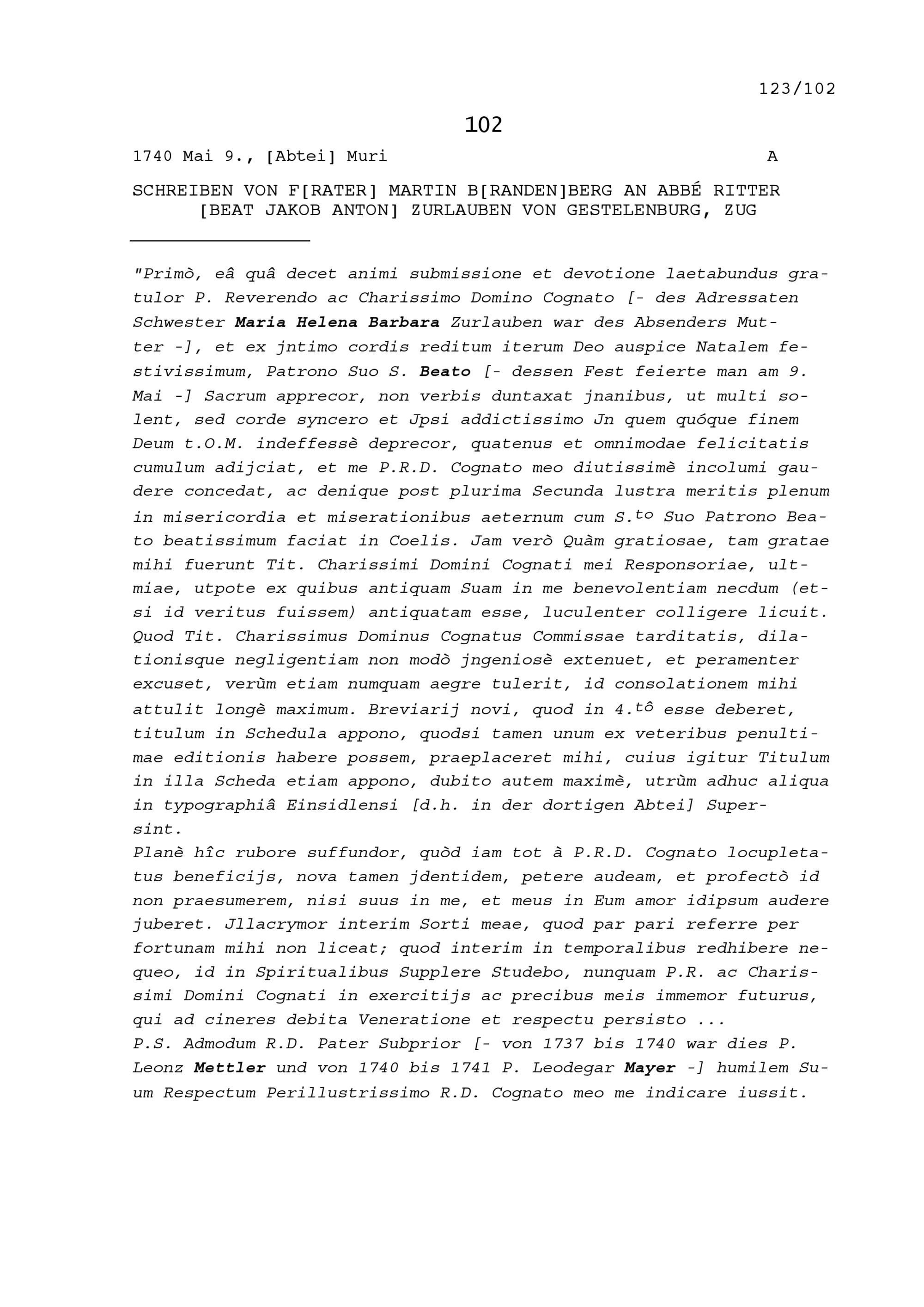 Schreiben von Martin Brandenberg, Konventuale, an Beat Jakob Anton Zurlauben, Priester, Zug