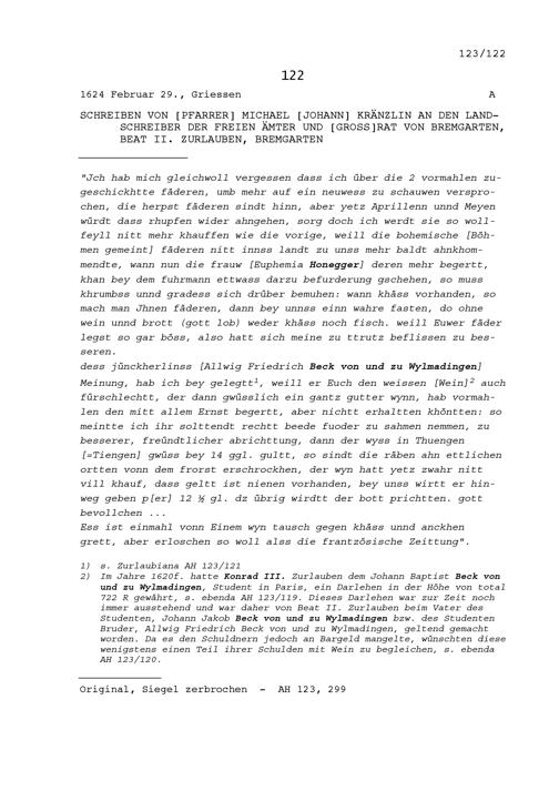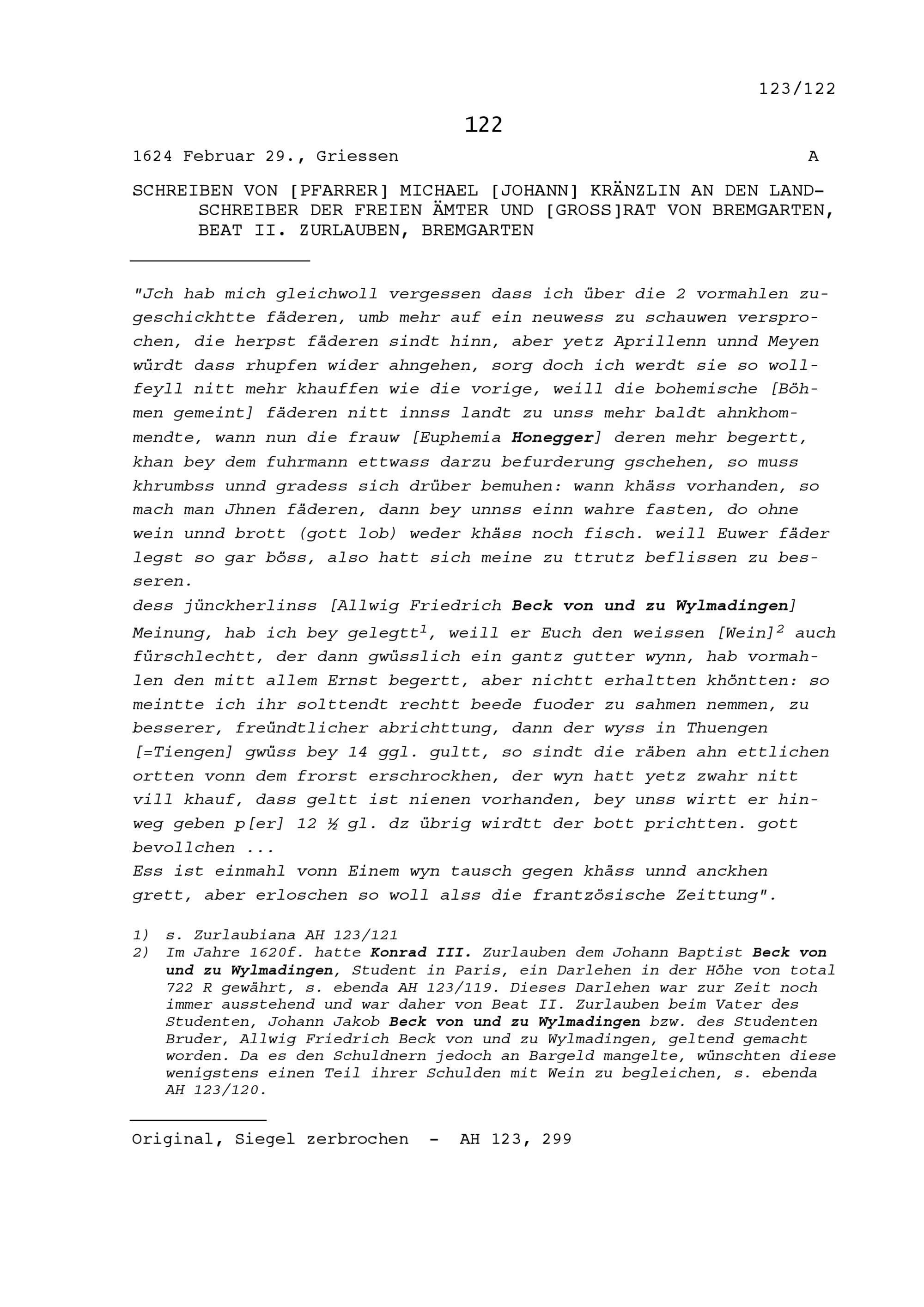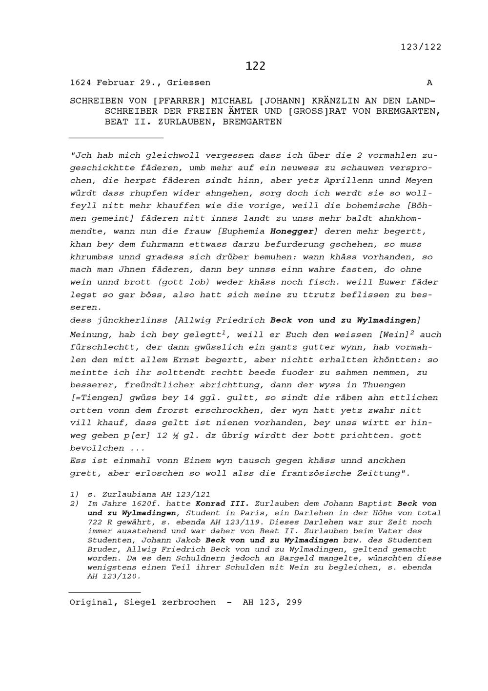 Schreiben von Michael Johann Kränzlin, Pfarrer, an Beat II. Zurlauben, Landschreiber der Freien Ämter und Grossrat von Bremgarten, Bremgarten