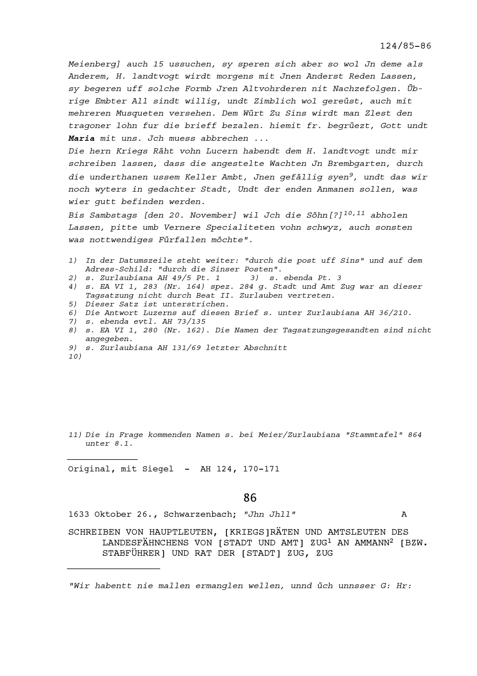 Schreiben von Hauptleuten, Kriegsräten und Amtsleuten des Landesfähnleins von Stadt und Amt Zug an Ammann (Stabführer) und Rat der Stadt Zug, Zug