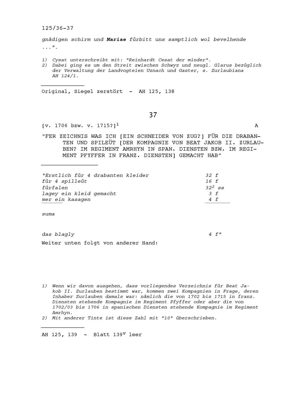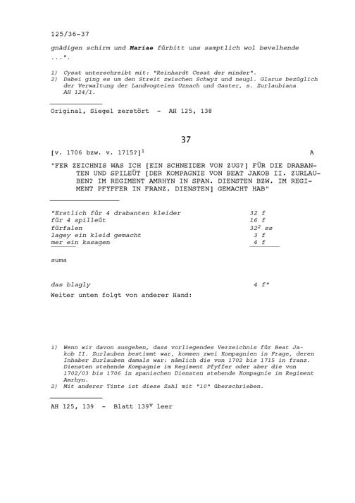 Rechnungsnotiz eines Schneiders von Zug für die Trabanten und Spielleute der Kompanie von Beat Jakob II. Zurlauben im Regiment Amrhyn in spanischen Diensten beziehungsweise im Regiment Pfyffer in französischen Diensten