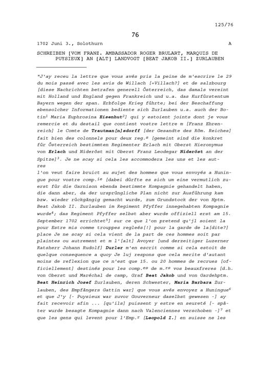 Schreiben von Roger Brûlart, Marquis de Puysieux, Ambassador von Frankreich, an Beat Jakob II. Zurlauben, Altlandvogt