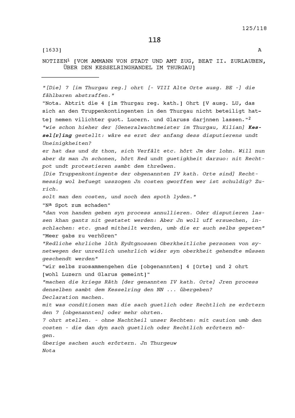 Notiz von Beat II. Zurlauben, Ammann von Stadt und Amt Zug, über den Kesselringhandel im Thurgau
