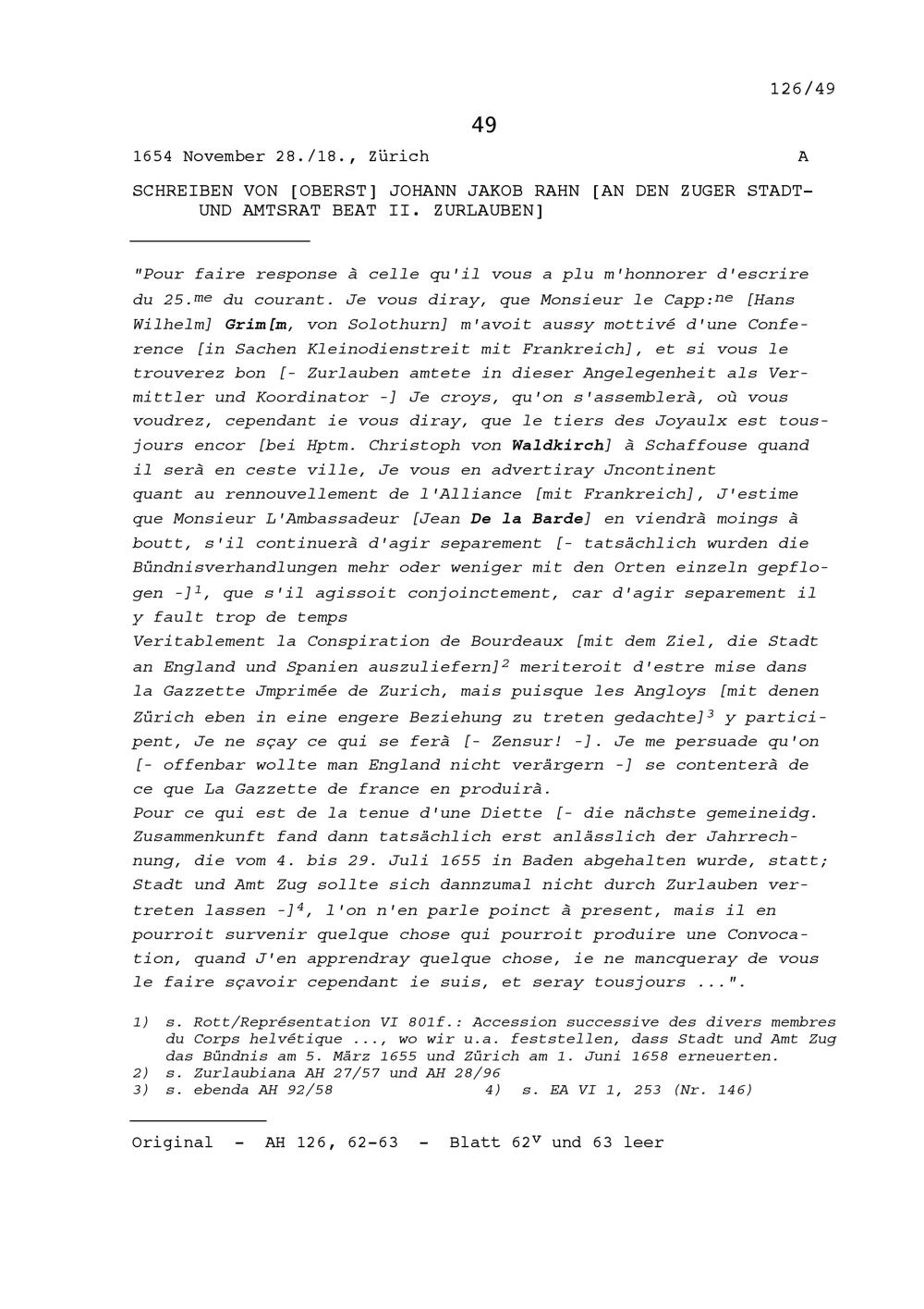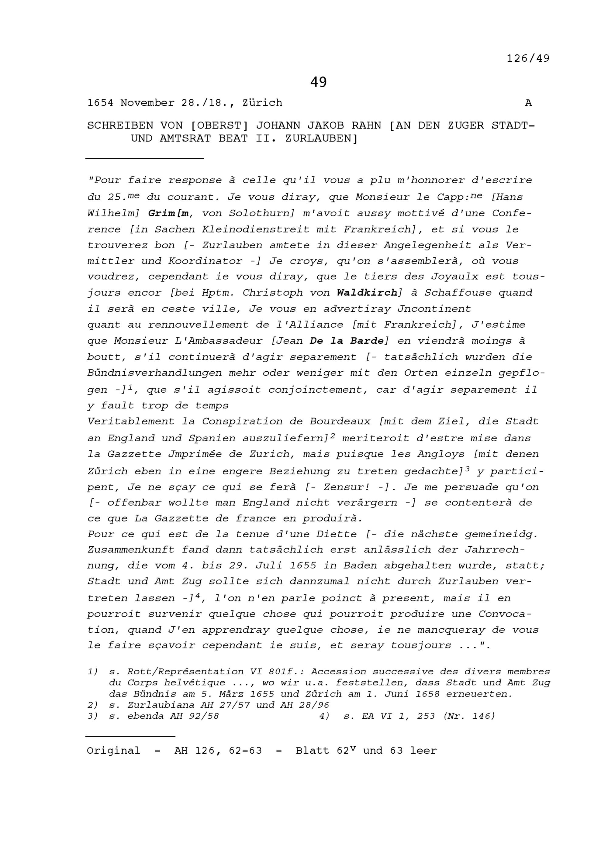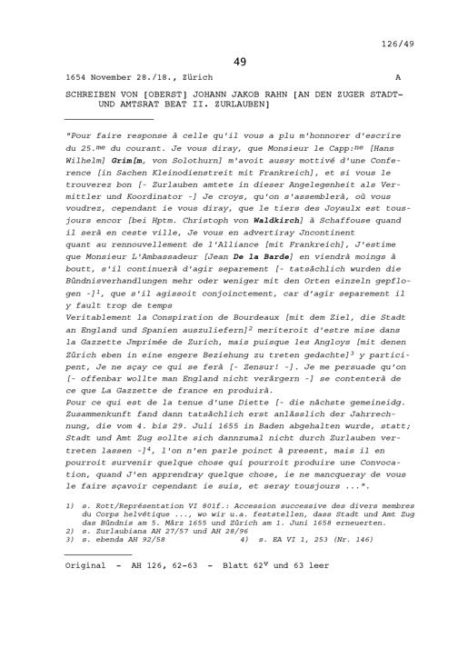 Schreiben von Johann Jakob Rahn, Oberst, an Beat II. Zurlauben, Stadt- und Amtrat...