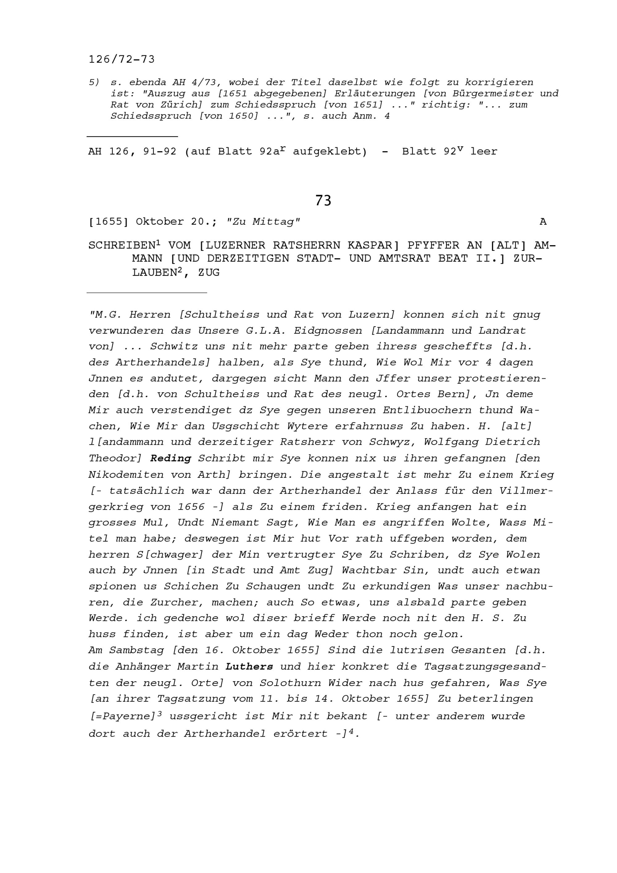 Schreiben von Kaspar Pfyffer, Luzerner Ratsherr, an Beat II. Zurlauben, Altammann...