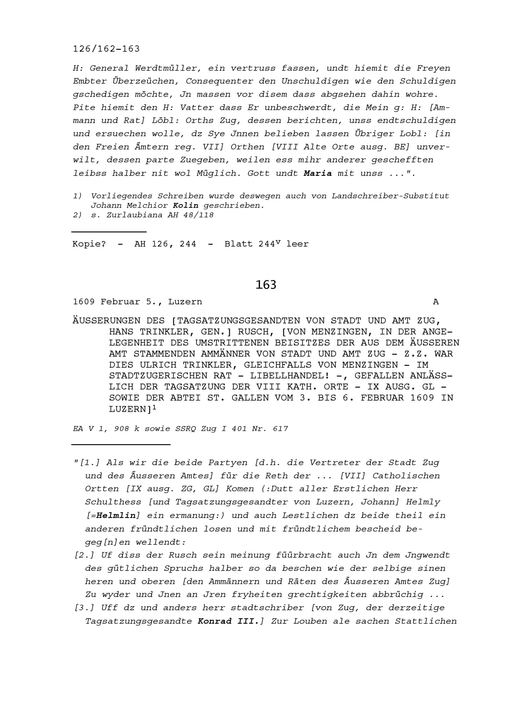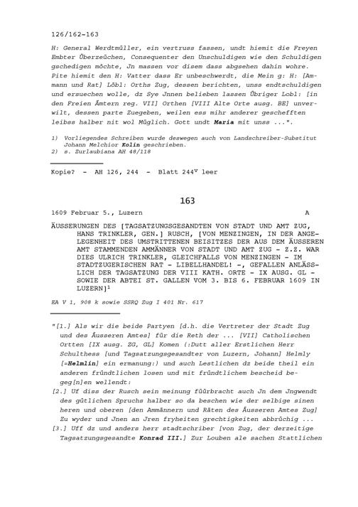 Äusserungen von Hans Trinkler, genannt Rusch, Tagsatzungsgesandter von Stadt und Amt Zug, von Menzingen, in der Angelegenheit des umstrittenen Beisitzes der aus dem Äusseren Amt stammenden Ammänner von Stadt und Amt Zug, nämlich Ulrich Trinkler, von Menzingen, im stadtzugerischen Rat (Libellhandel), gefallen anlässlich der Tagsatzung der Acht Katholischen Orte sowie der Abtei Sankt Gallen in Luzern vom 3. bis 6. Februar 1609
