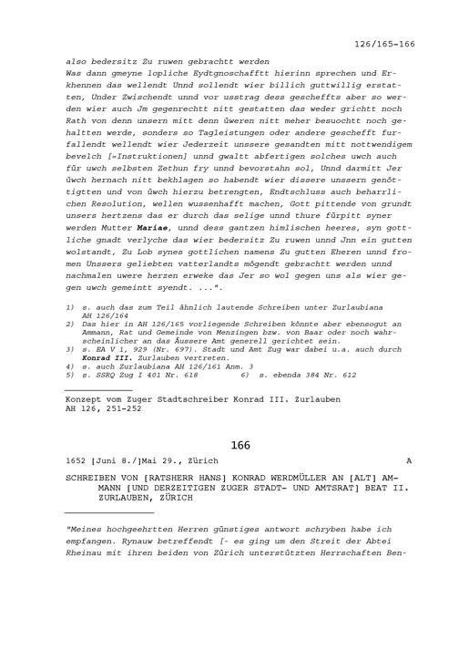 Schreiben von Hans Konrad Werdmüller, Ratsherr, an Beat II. Zurlauben, Altammann...