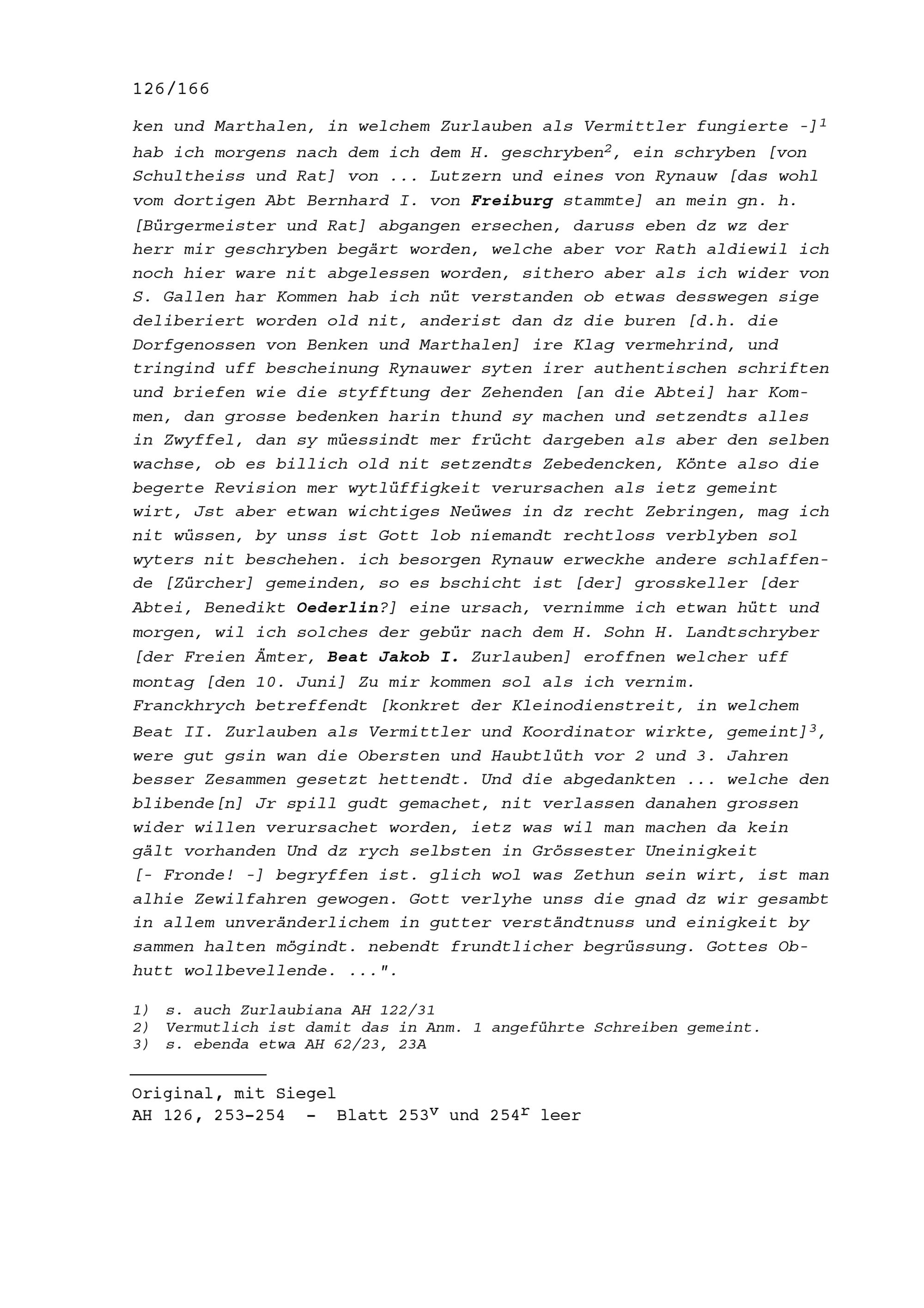 Schreiben von Hans Konrad Werdmüller, Ratsherr, an Beat II. Zurlauben, Altammann...