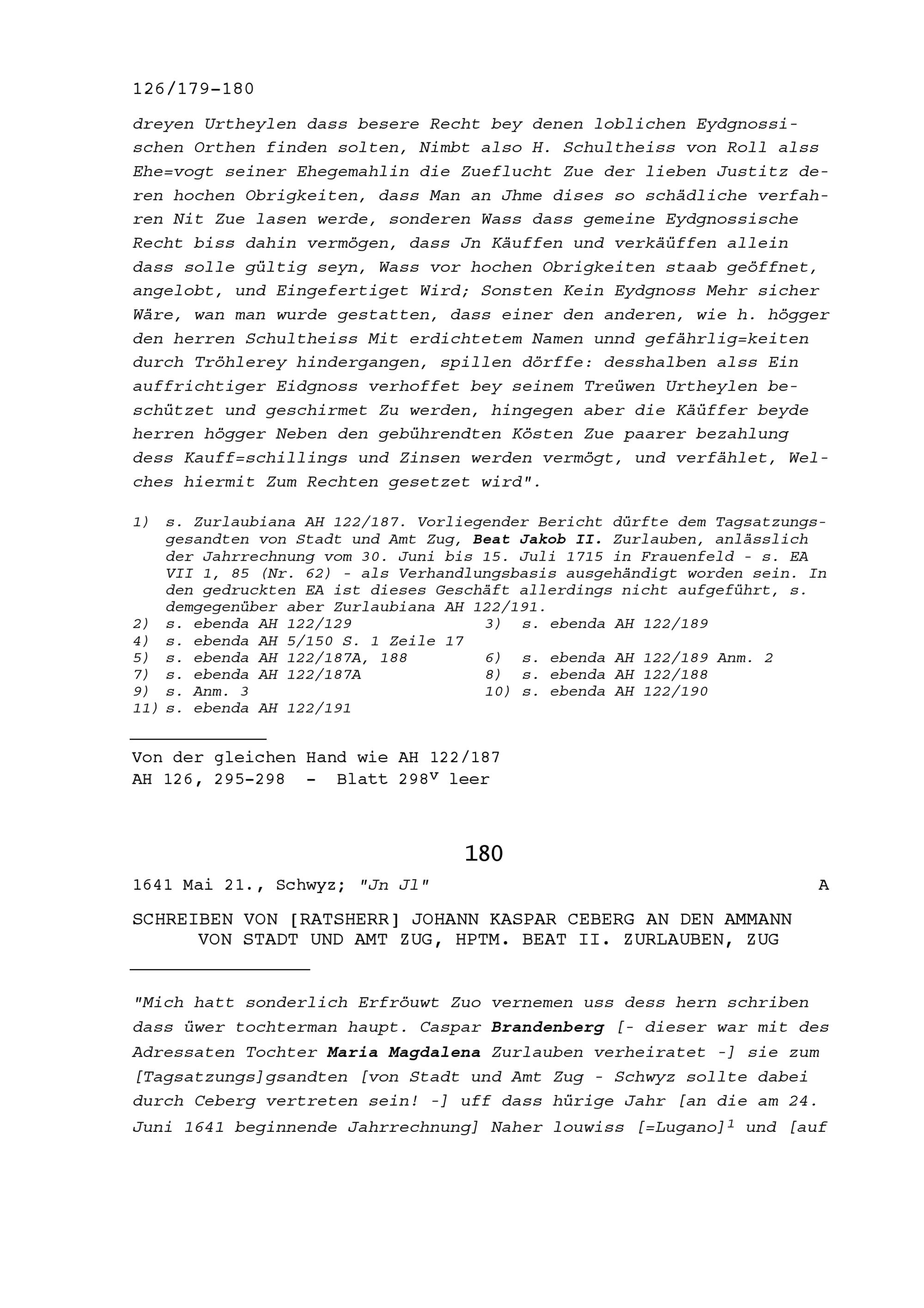 Schreiben von Johann Kaspar Ceberg, Ratsherr, an Beat II. Zurlauben, Ammann von Stadt und Amt Zug Hauptmann, Zug