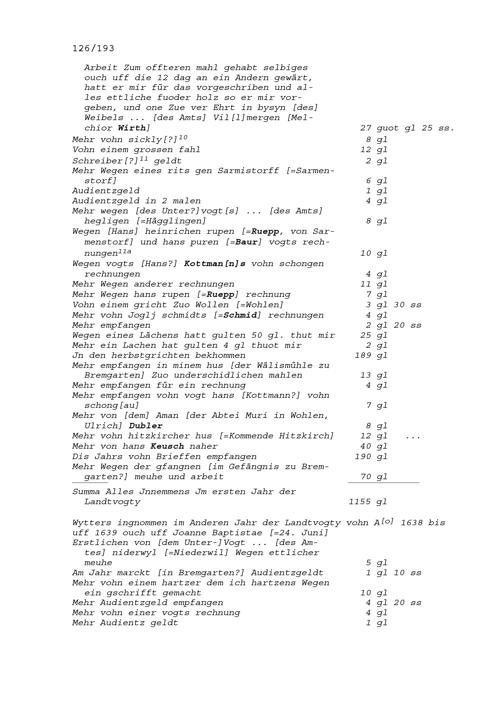 Einnahmen von Beat Jakob I. Zurlauben, Landschreiber der Freien Ämter, von 1636 bis 1644
