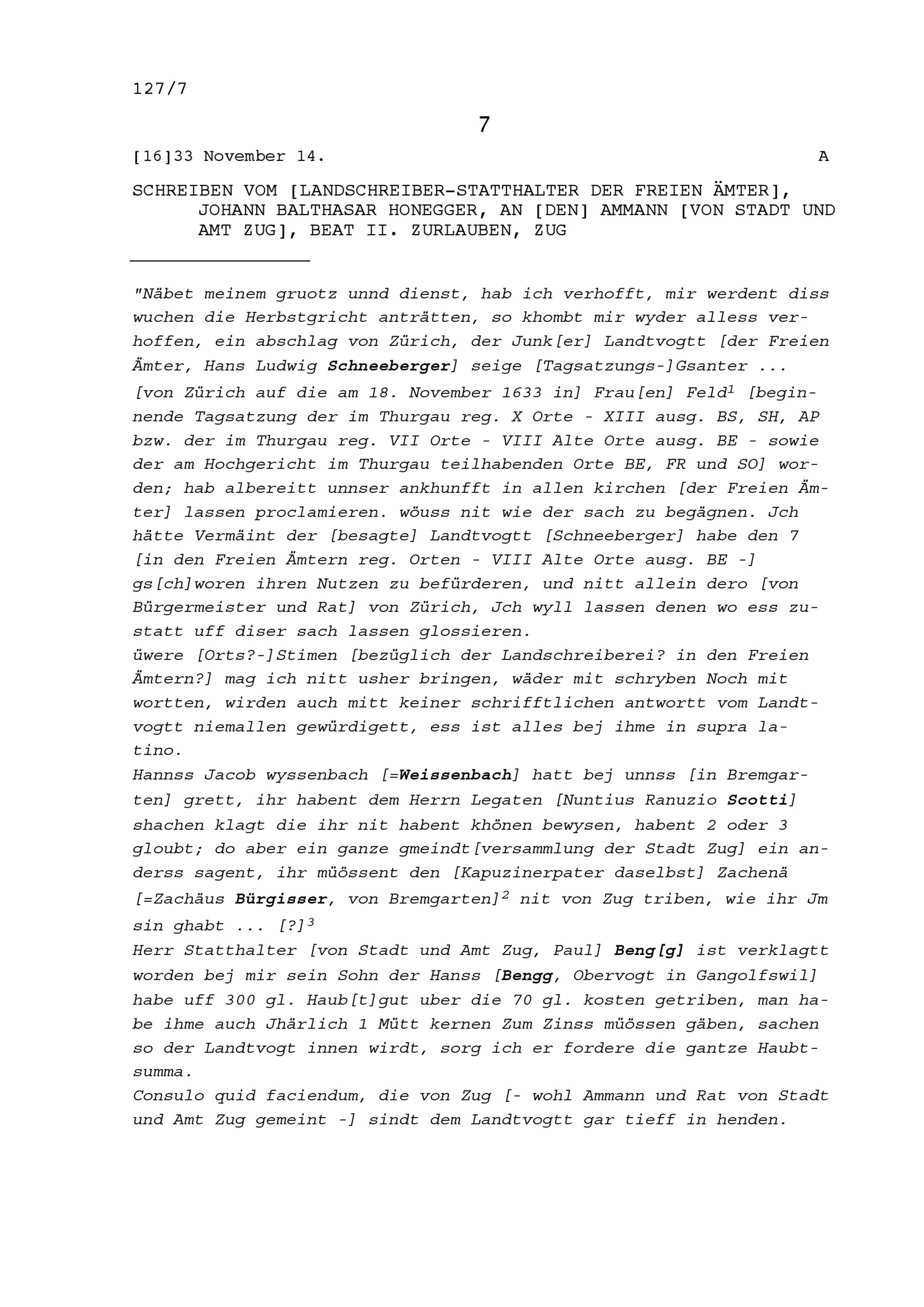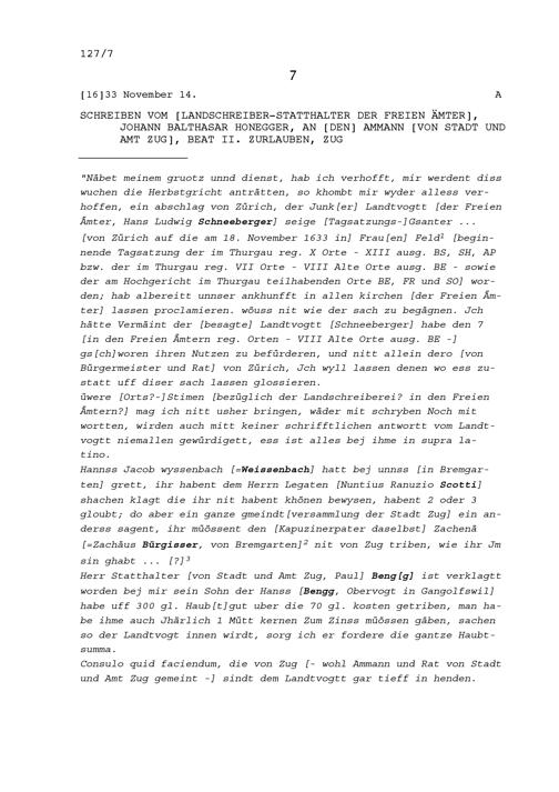 Schreiben von Johann Balthasar Honegger, Landschreiberstatthalter der Freien Ämter, an Beat II. Zurlauben, Ammann von Stadt und Amt Zug, Zug