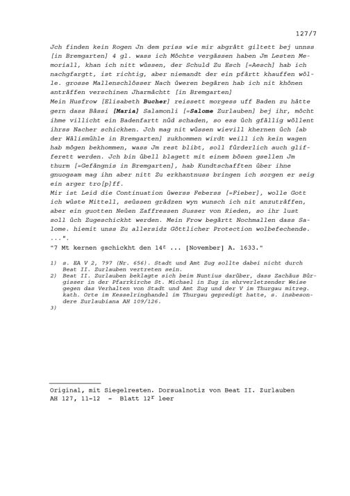 Schreiben von Johann Balthasar Honegger, Landschreiberstatthalter der Freien Ämter, an Beat II. Zurlauben, Ammann von Stadt und Amt Zug, Zug
