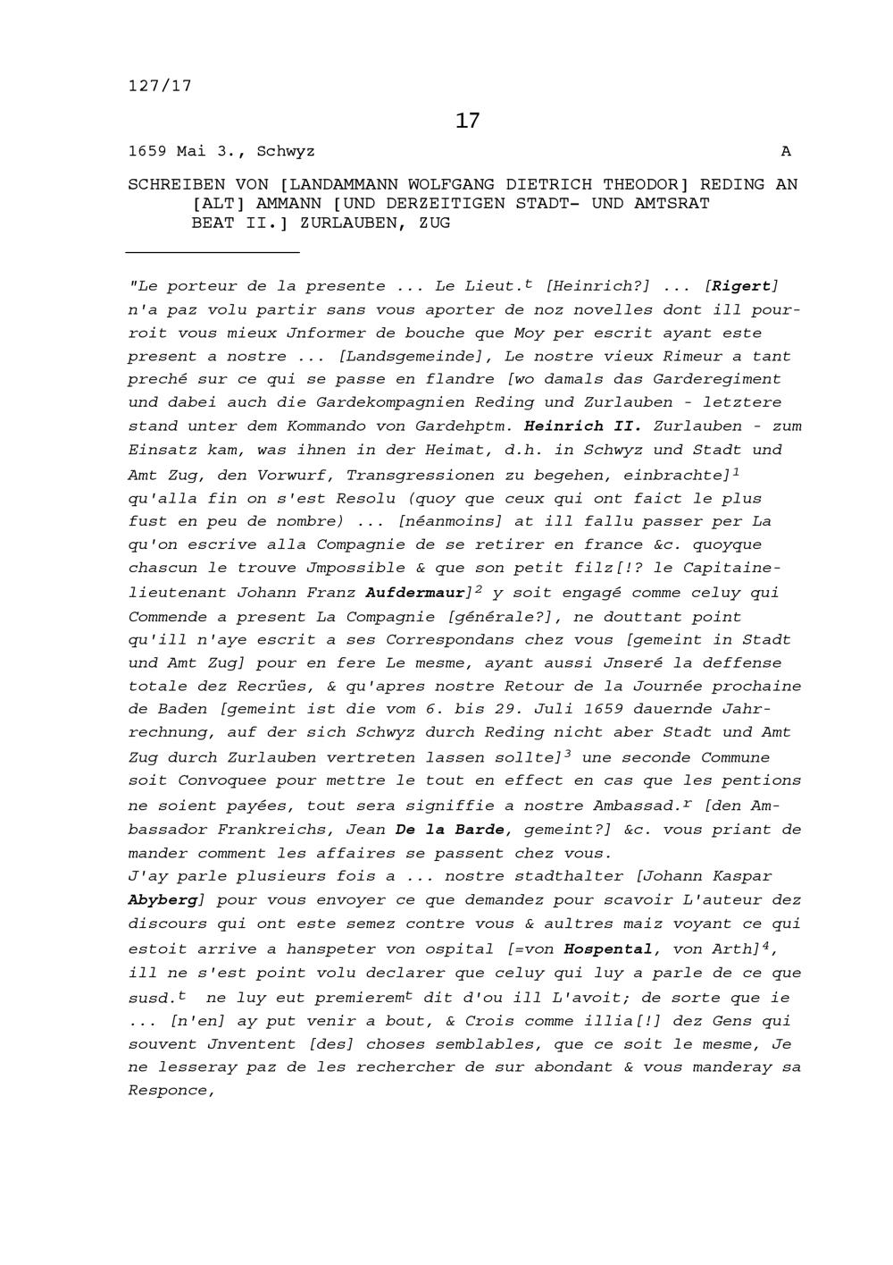 Schreiben von Wolfgang Dietrich Theodor Reding, Landammann, an Beat II. Zurlauben, Altammann und Stadt- und Amtrat, Zug