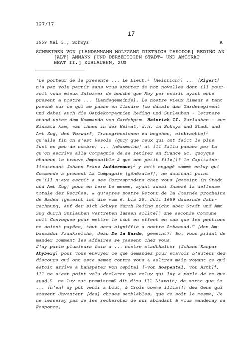 Schreiben von Wolfgang Dietrich Theodor Reding, Landammann, an Beat II. Zurlauben,...