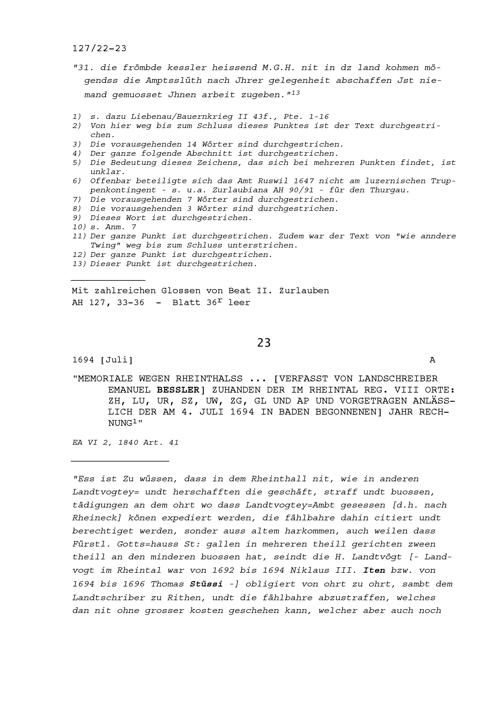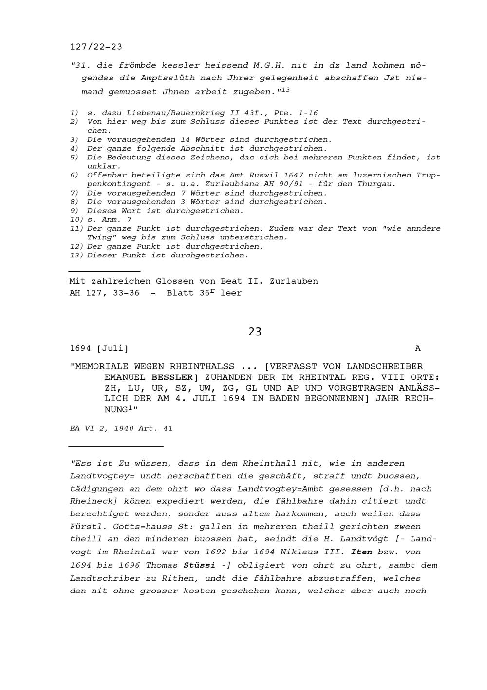 Bericht wegen des Rheintals, verfasst von Emanuel Bessler, Landschreiber, zuhanden der im Rheintal regierenden Acht Orte Zürich, Luzern, Uri, Schwyz, Unterwalden (Ob- und Nidwalden), Zug, Glarus und Appenzell (Innerrhoden und Ausserrhoden), vorgetragen anlässlich der am 4. Juli 1694 in Baden begonnenen Jahrrechnung