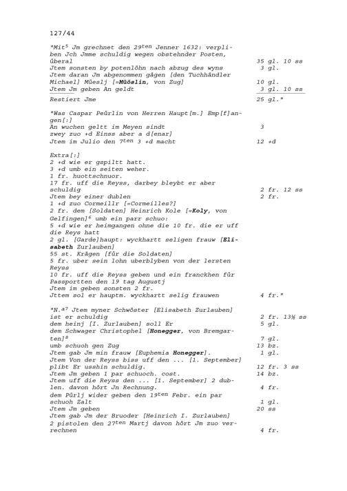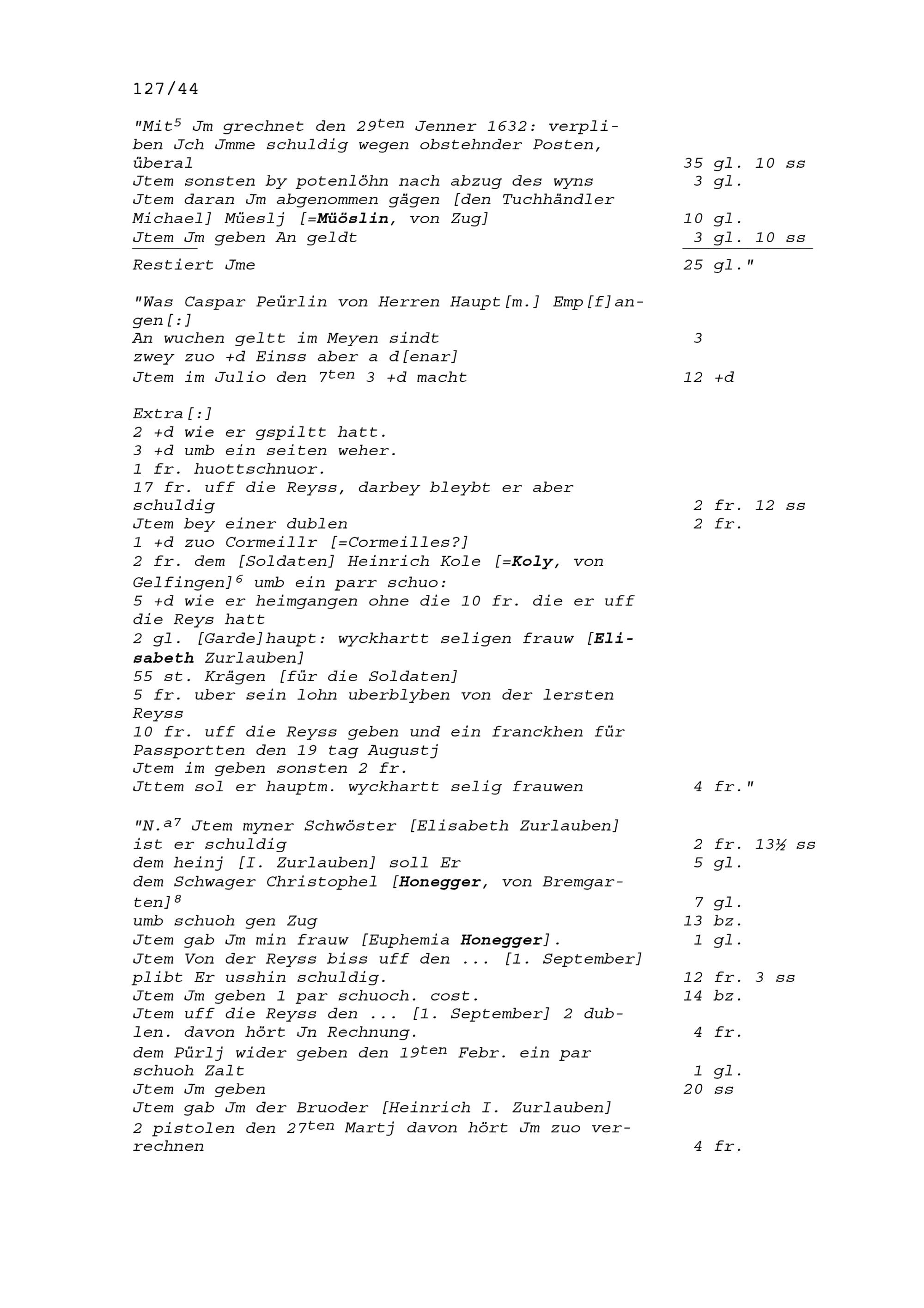 Abrechnung zwischen Beat II. Zurlauben, Gardehauptmann, einerseits und Kaspar Pürli, Bote, von Bremgarten, und Lienhard Schnider, Bote, andererseits
