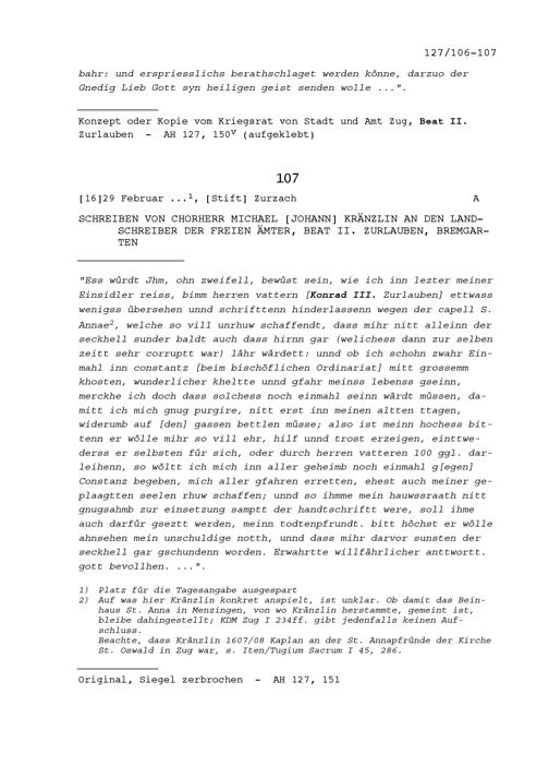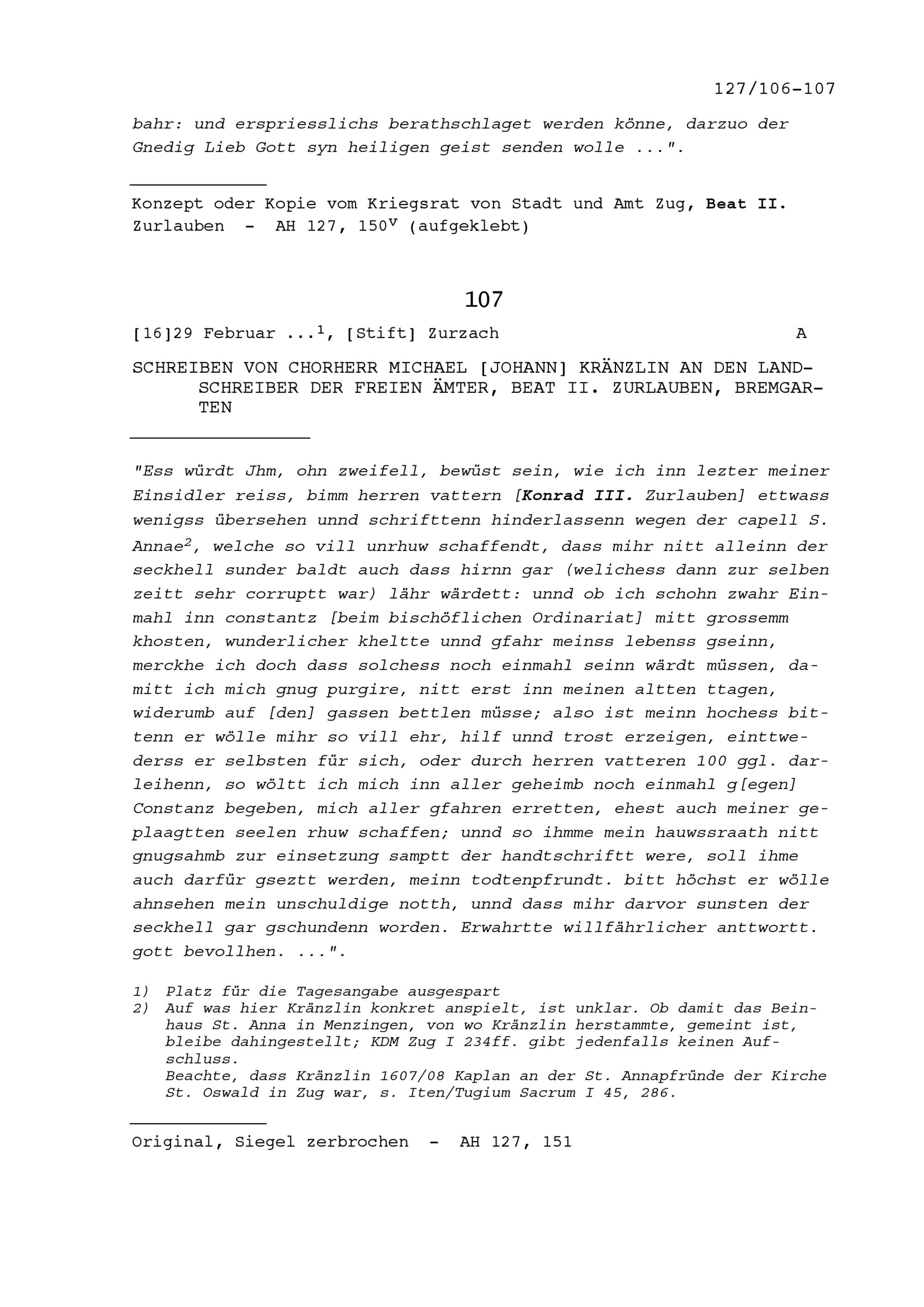 Schreiben von Michael Johann Kränzlin, Chorherr, an Beat II. Zurlauben, Landschreiber...