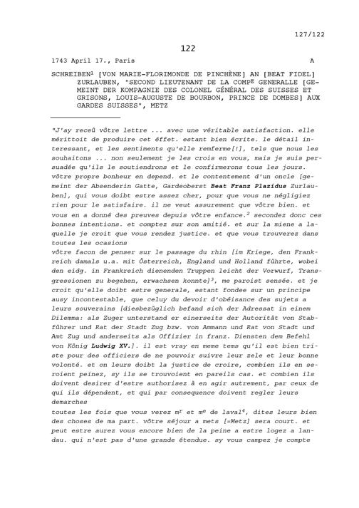 Schreiben von Marie-Florimonde de Pinchène an Beat Fidel Zurlauben, Leutnant der...