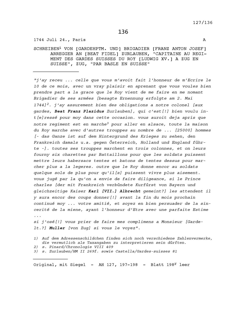 Schreiben von Franz Anton Josef Arregger, Gardehauptmann und Brigadier, an Beat Fidel Zurlauben, Hauptmann der Schweizer Garde, Zug