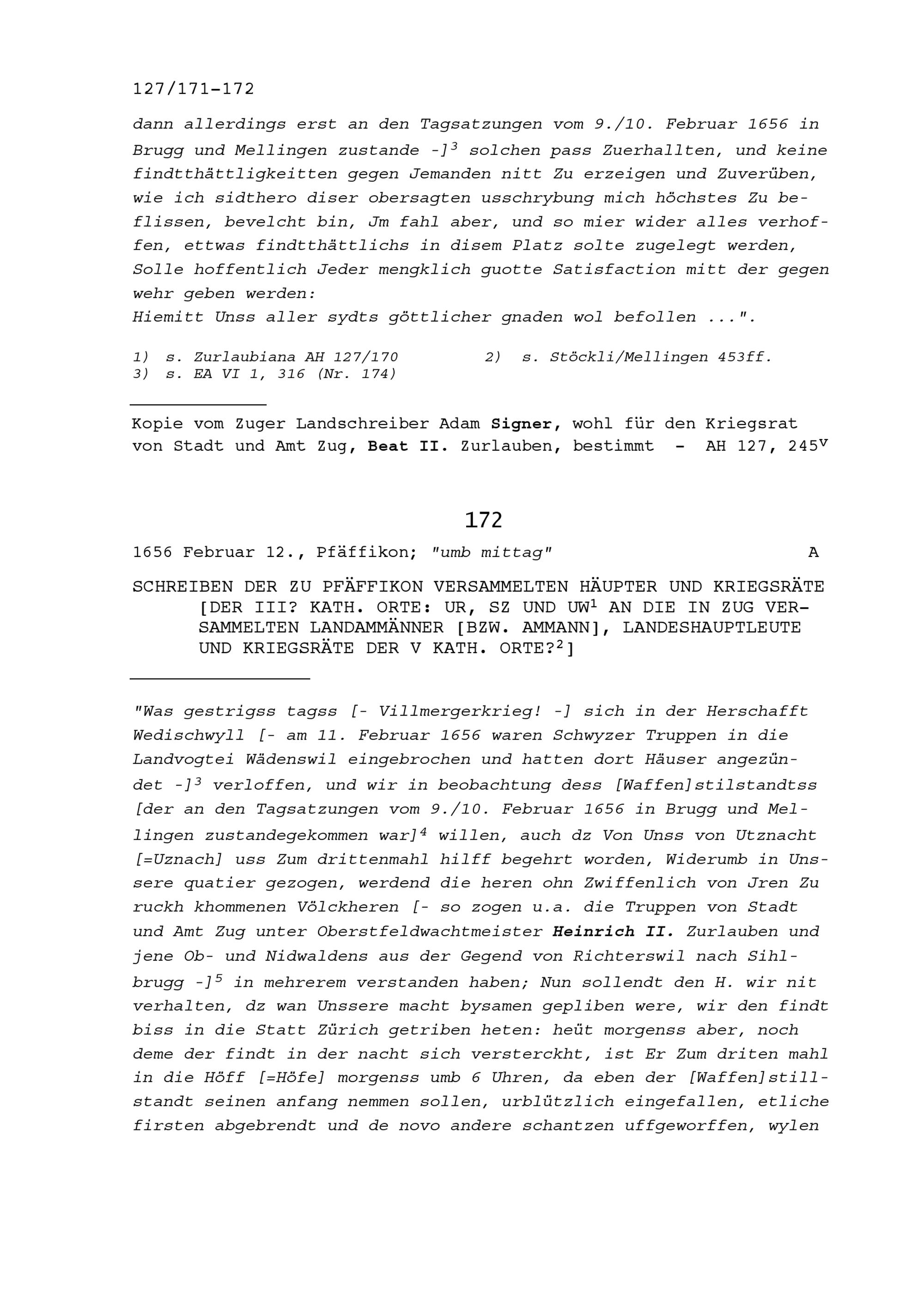 Schreiben der zu Pfäffikon versammelten Häupter und Kriegsräte der Drei Katholischen Orte Uri, Schwyz und Unterwalden (Ob- und Nidwalden) an die in Zug versammelten Landammänner beziehungsweise Ammann, Landeshauptleute und Kriegsräte der Fünf Katholischen Orte
