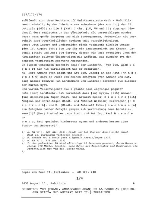 Schreiben von Jean de la Barde, Ambassador von Frankreich, an Beat II. Zurlauben,...