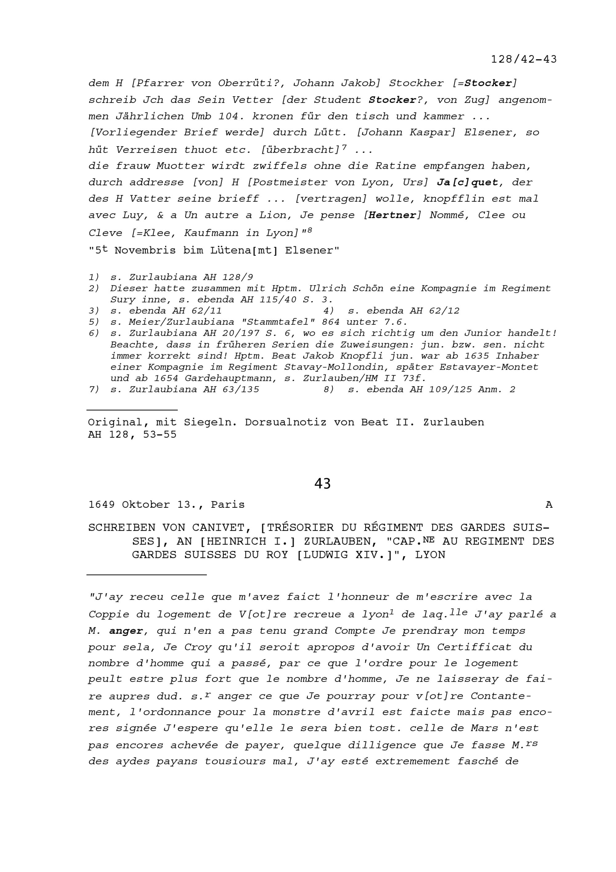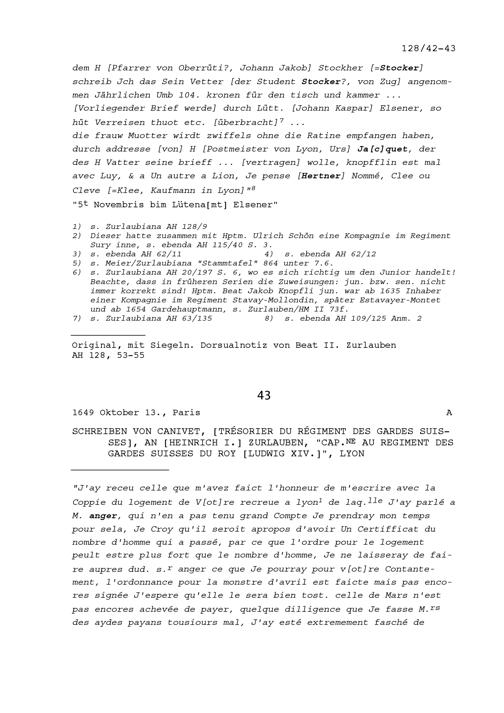 Schreiben von NN Canvint, Trésorier im Regiment der Schweizer Garden, an Heinrich I. Zurlauben, Hauptmann im Regiment der Schweizer Garden, Lyon