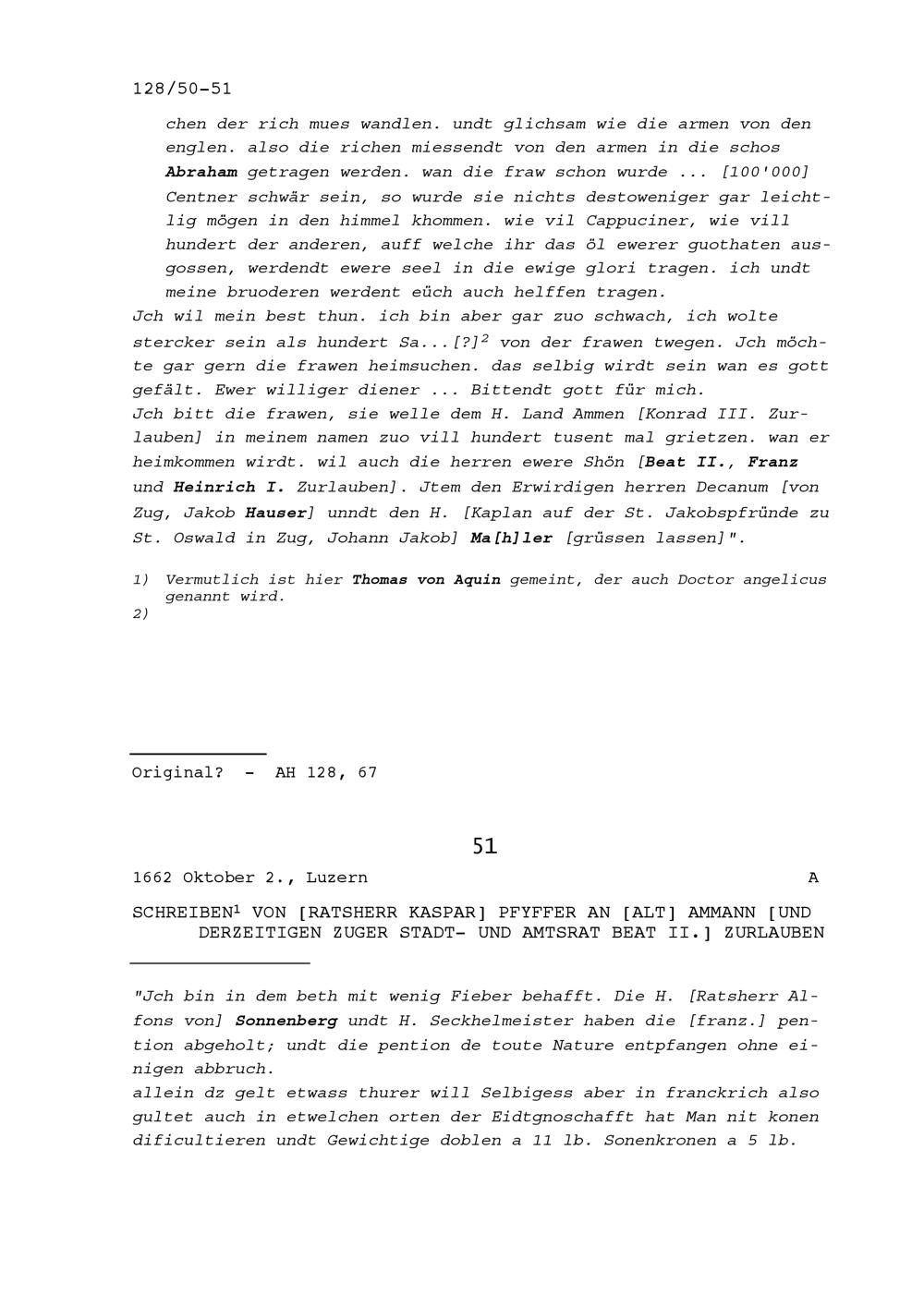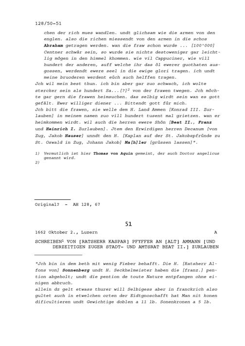 Schreiben von Kaspar Pfyffer, Ratsherr, an Beat II. Zurlauben, Altammann und Stadt-...