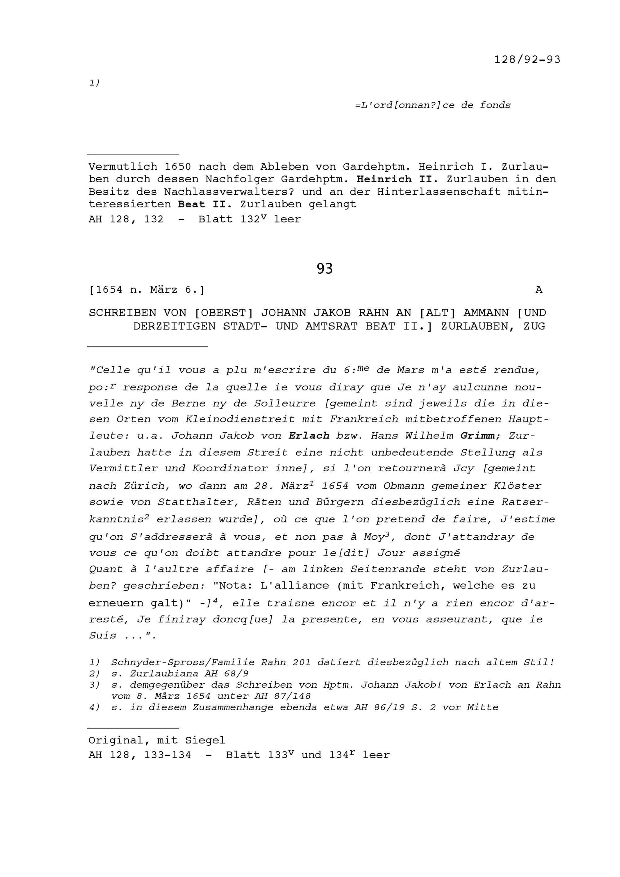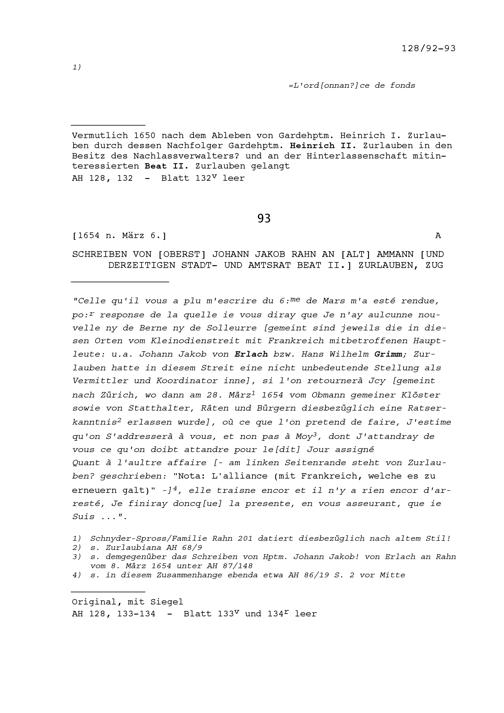 Schreiben von Johann Jakob Rahn, Oberst, an Beat II. Zurlauben, Altammann und Stadt-...