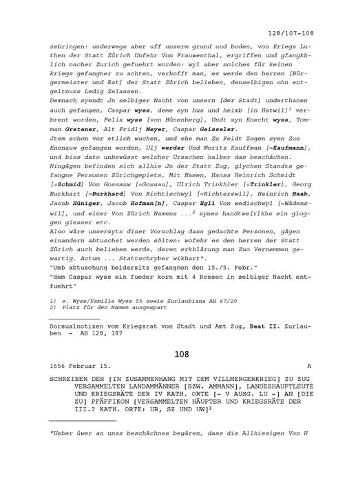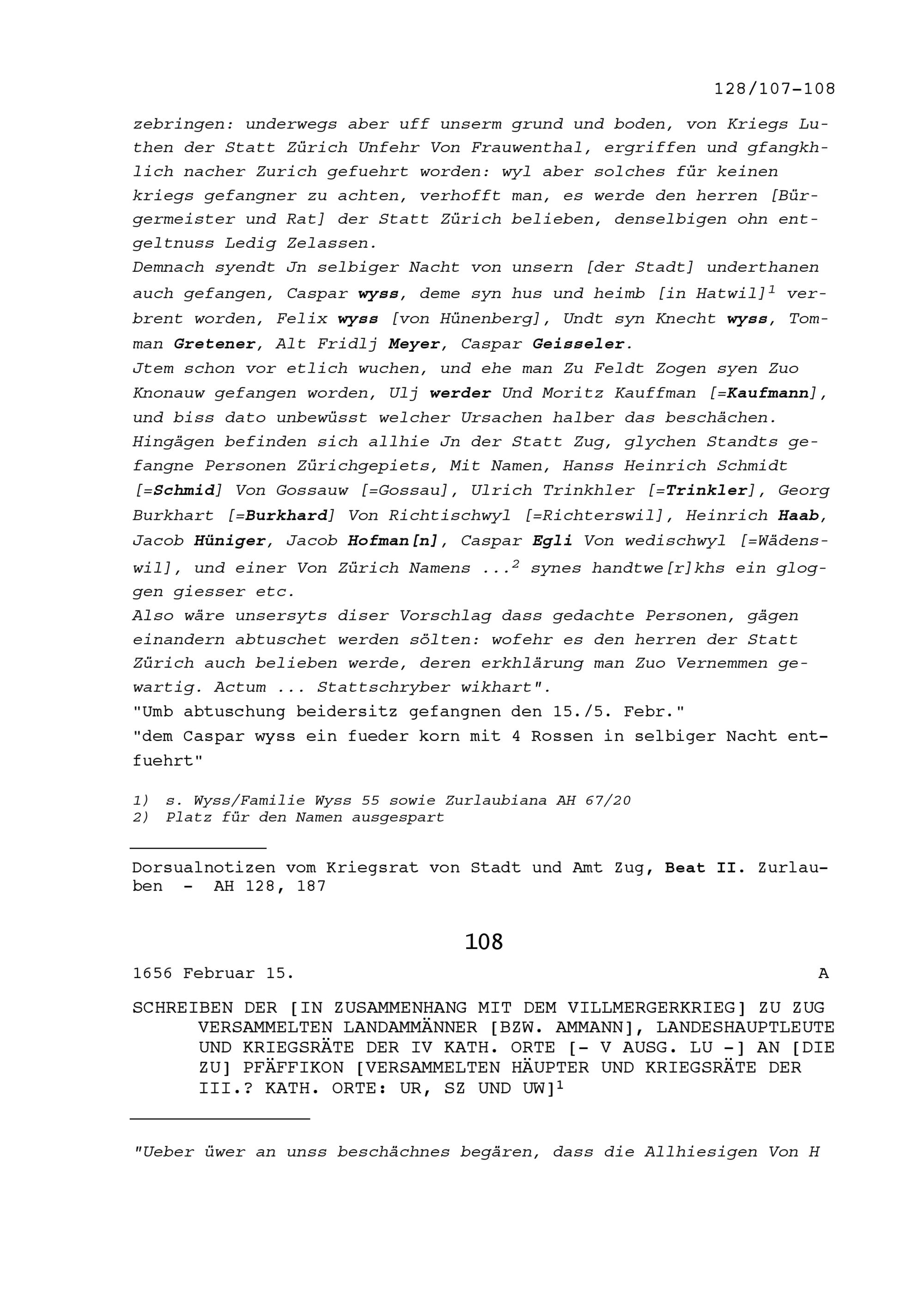 Schreiben der in Zusammenhang mit dem Villmergerkrieg in Zug versammelten Landammänner beziehungsweise des Ammanns, der Landeshauptleute und Kriegsräte der Vier Katholischen Orte an die in Pfäffikon versammelten Häupter und Kriegsräte der Drei Katholischen Orte Uri, Schwyz und Unterwalden