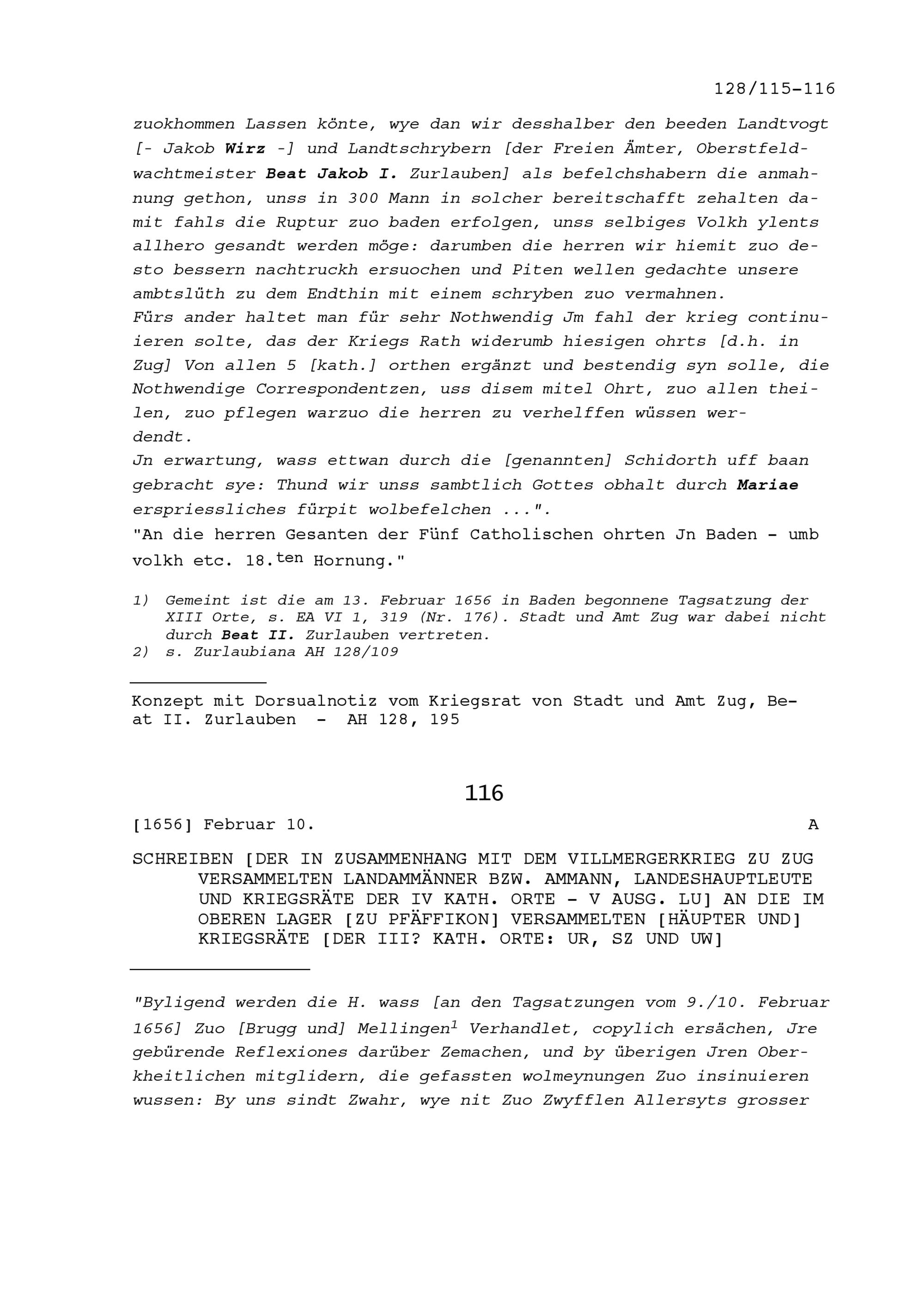 Schreiben der in Zusammenhang mit dem Villmergerkrieg in Zug versammelten Landammänner beziehungsweise des Ammann, der Landeshauptleute und Kriegsräte der Vier Katholischen Orte an die im Oberen Lager in Pfäffikon versammelten Häupter und Kriegsräte der Drei Katholischen Orte Uri, Schwyz und Unterwalden