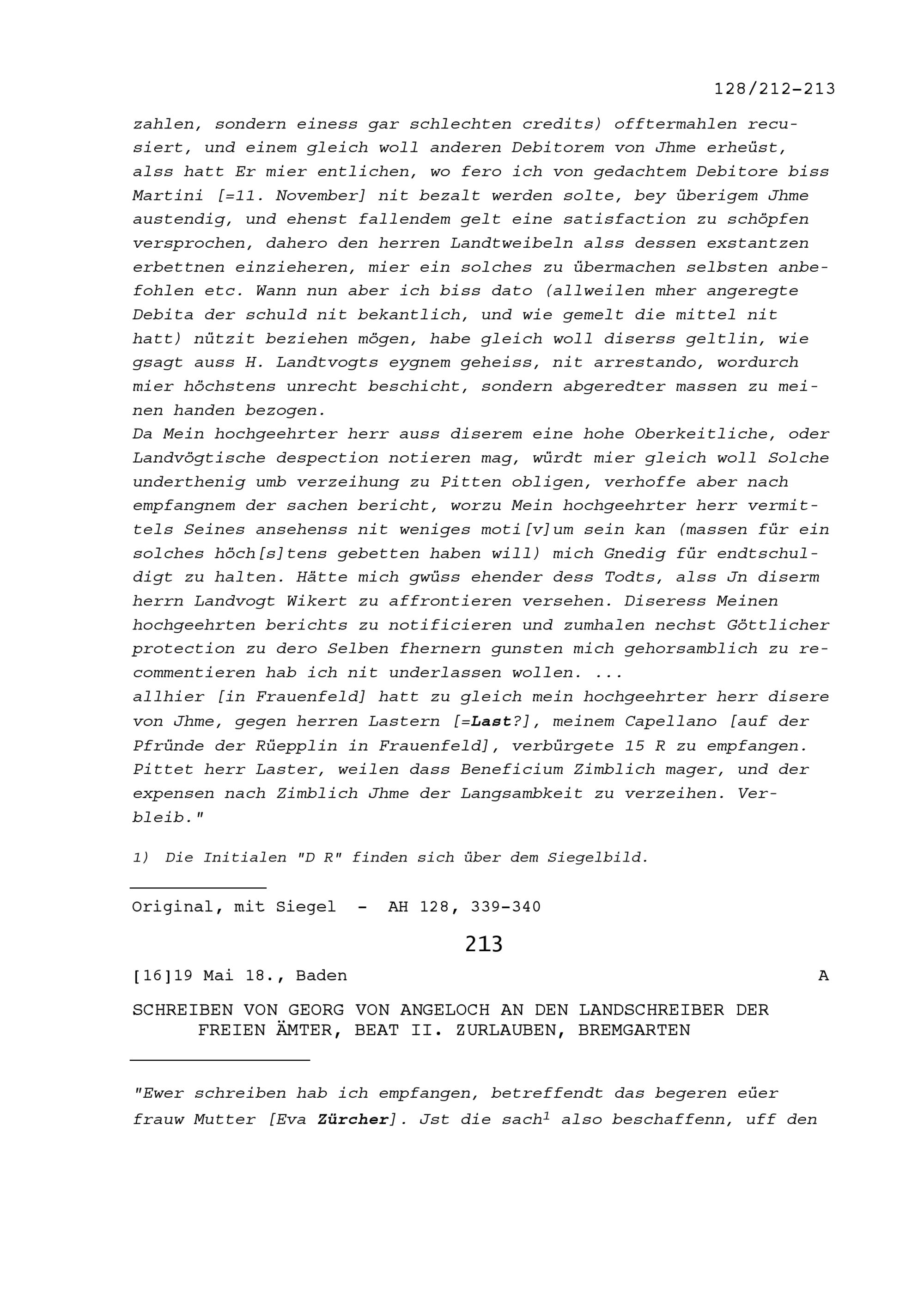 Schreiben von Georg von Angeloch an Beat II. Zurlauben, Landschreiber der Freien Ämter, Bremgarten