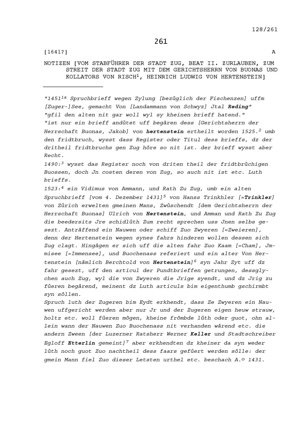 Notiz von Beat II. Zurlauben, Stabführer der Stadt Zug, zum Streit der Stadt Zug mit Heinrich Ludwig von Hertenstein, Gerichtsherr von Buonas und Kollator von Risch